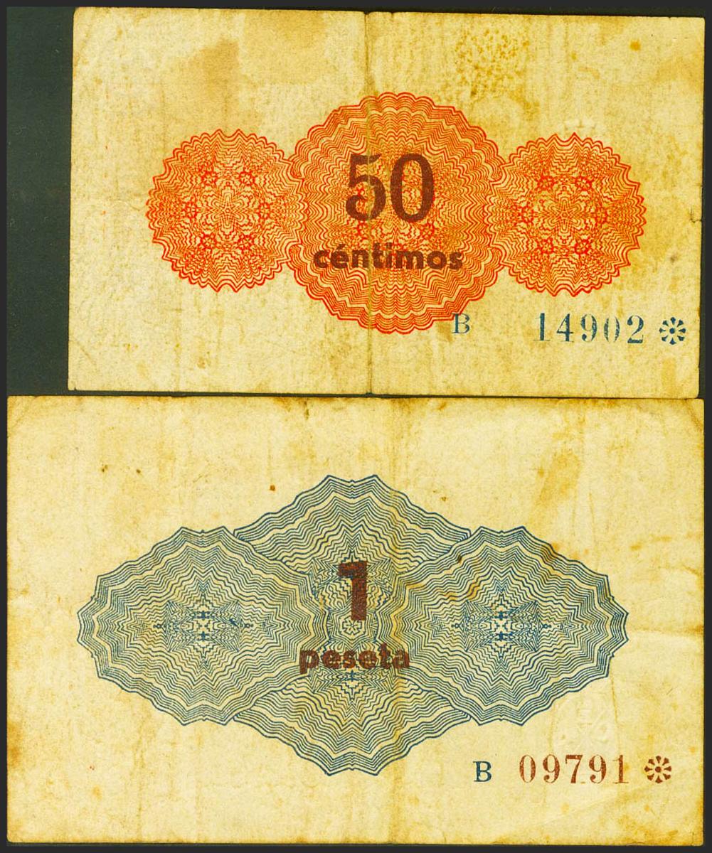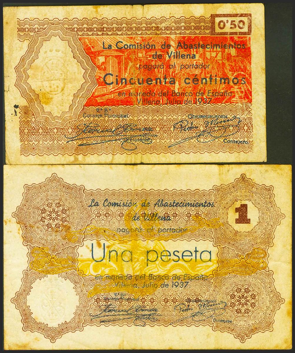 VILLENNA (ALICANTE). 50 Cents and 1 Peseta. July 1937. Series B, both. (González: 5763/64). Very Fine.