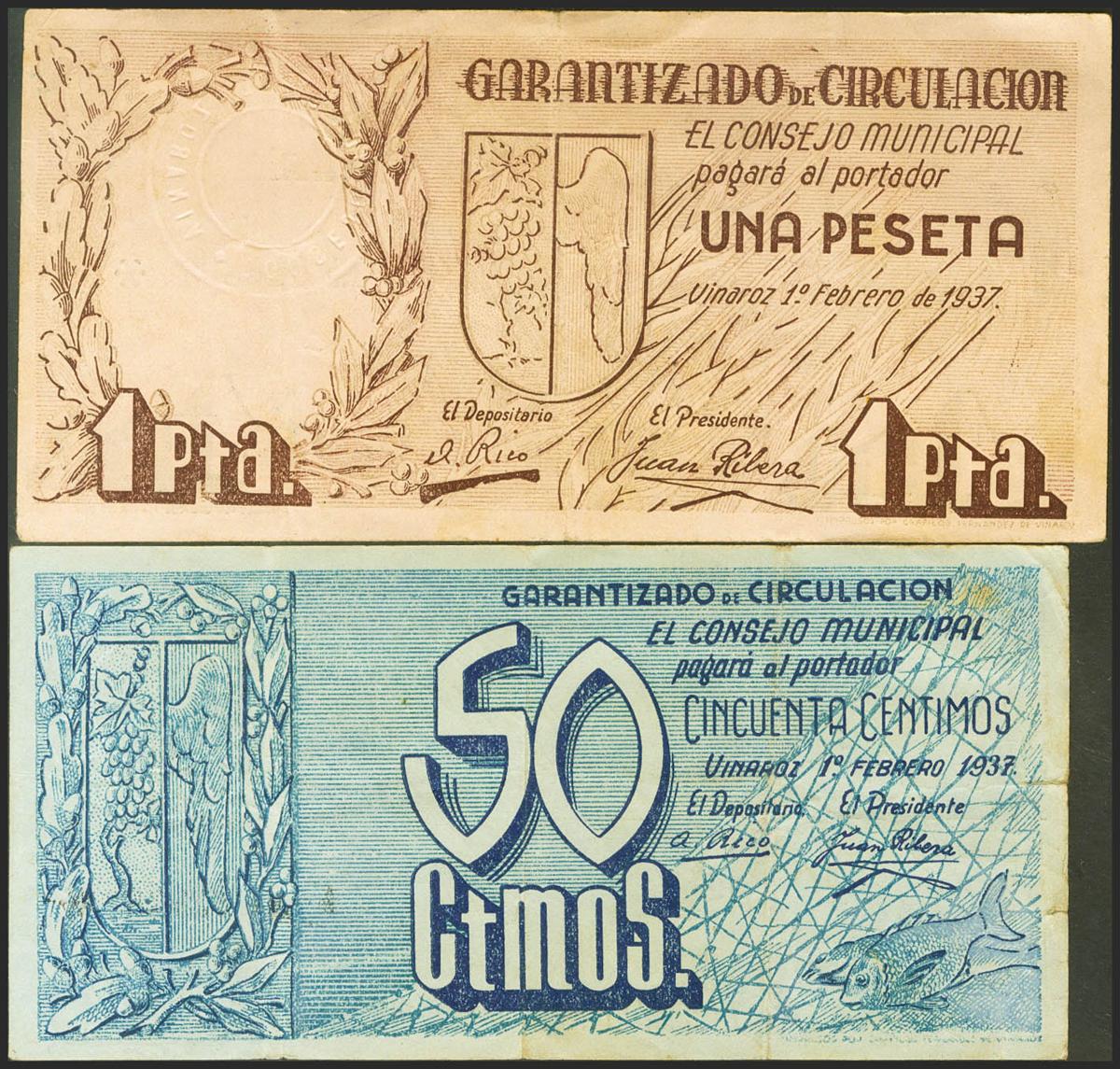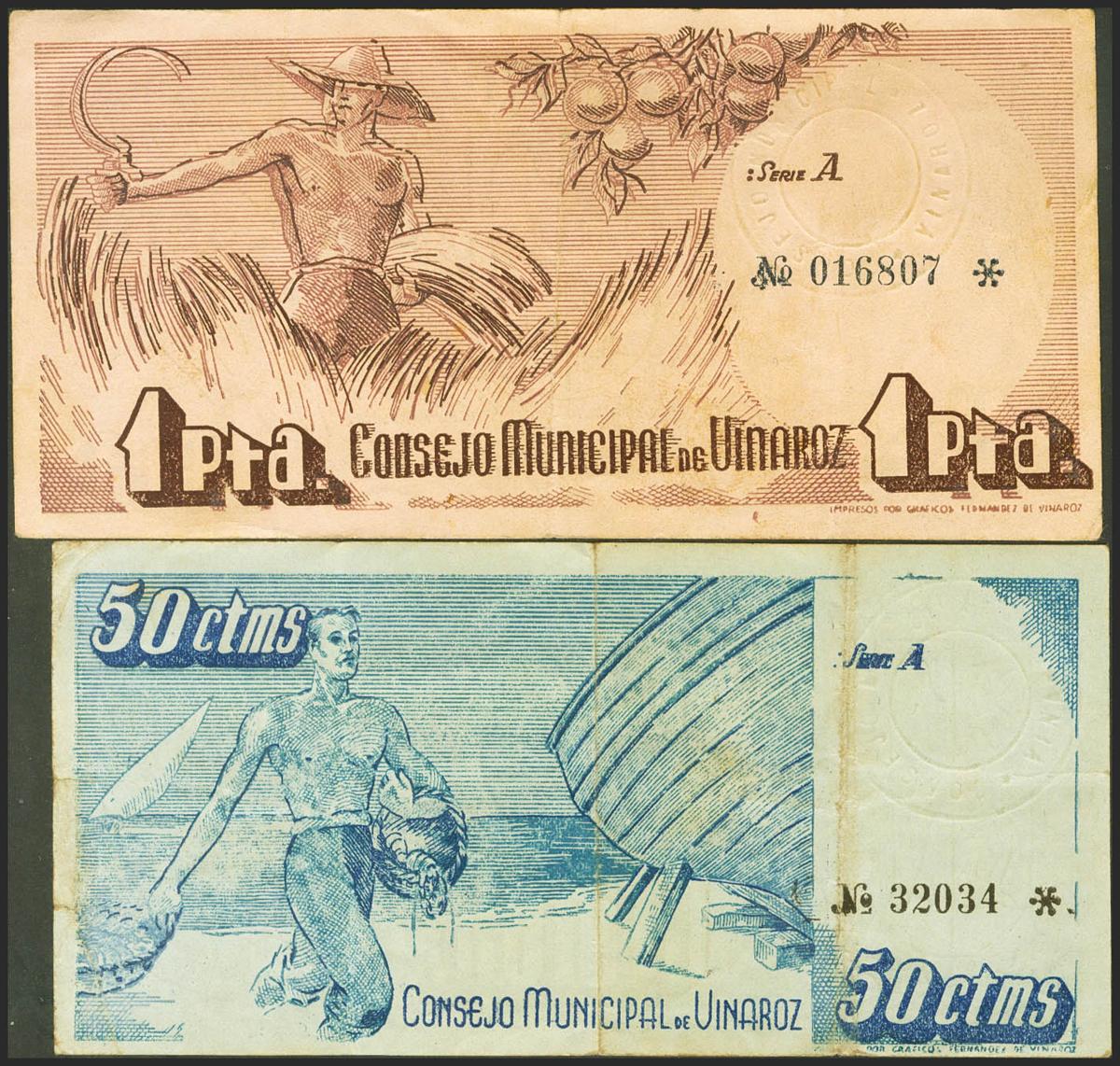 VINAROZ (CASTELLÓN). 50 Cents and 1 Peseta. February 1, 1937. Series A, both. (Gonzalez: 5774, 5775). Very Fine.