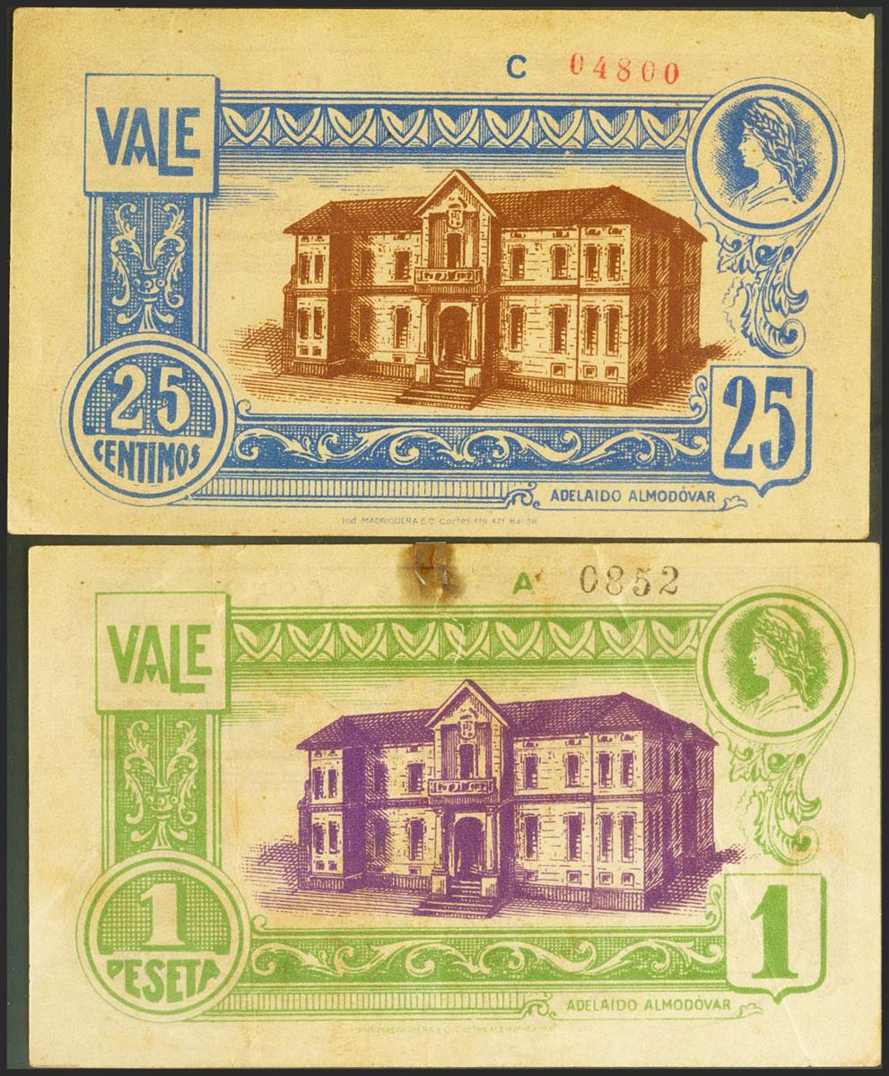 VISO DEL MARQUES (CIUDAD REAL). 25 Cents and 1 Peseta. July 1937. Series C and A, respectively. (Gonzalez: 5783, 5785). rare. Very Fine.
