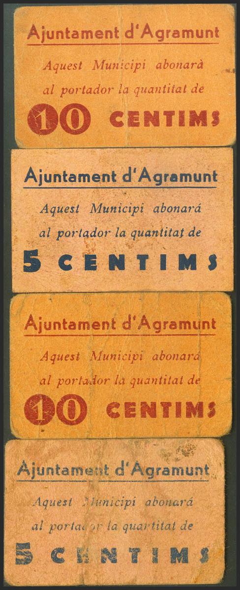 AGRAMUNT (LERIDA). 5 Cents (2) and 10 Cents (2). (1937ca). (González: 6016/19). Rare complete series. Very Fine/ Almost Very Fine.