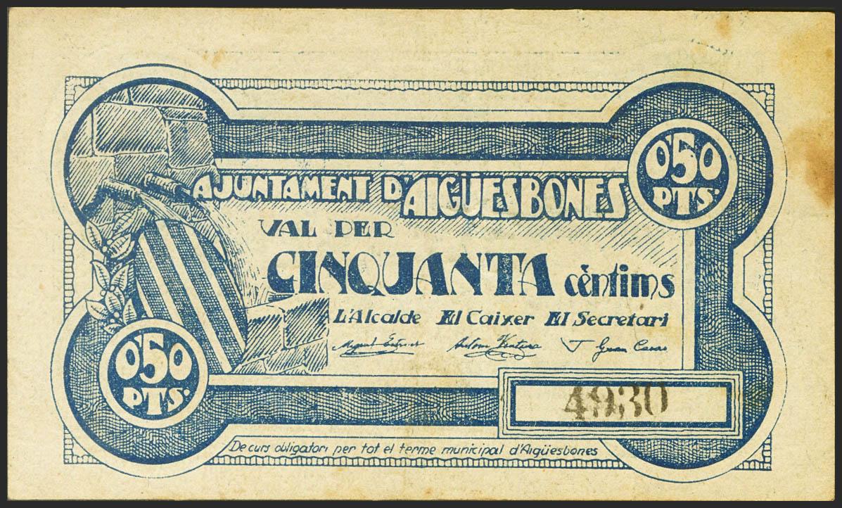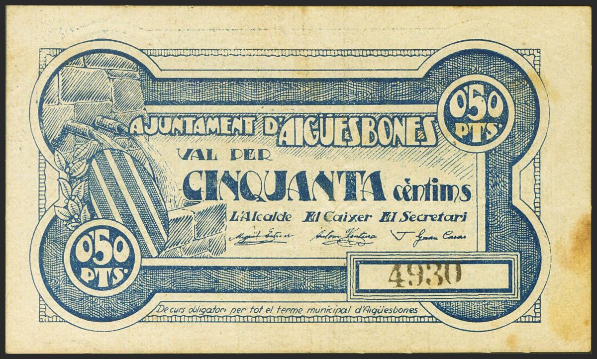 AIGUESBONES (BARCELONA). 50 cents. (1937ca). Front and back print the same. (Gonzalez: 6047). Rare. Good Very Fine.