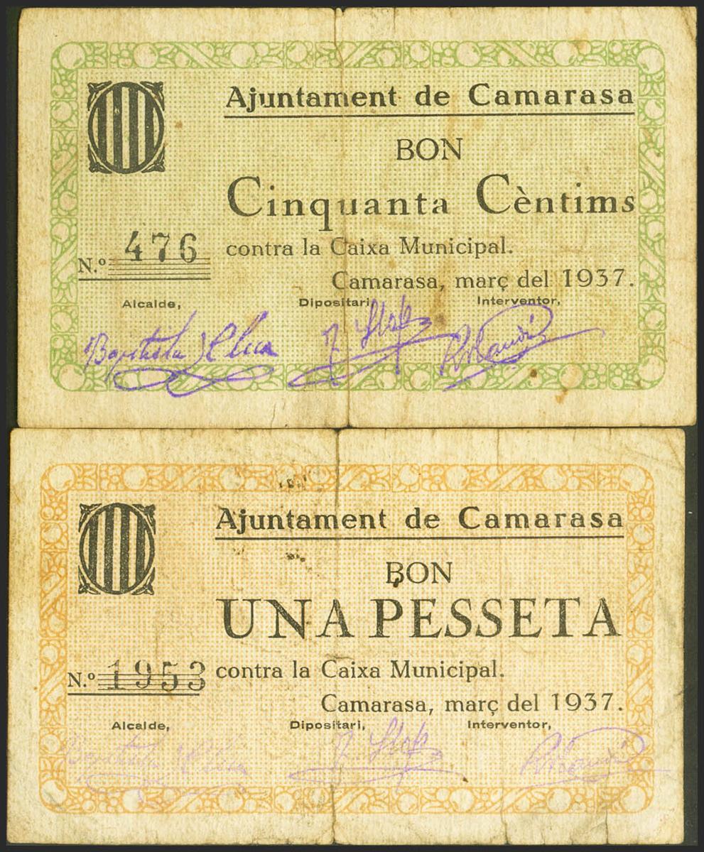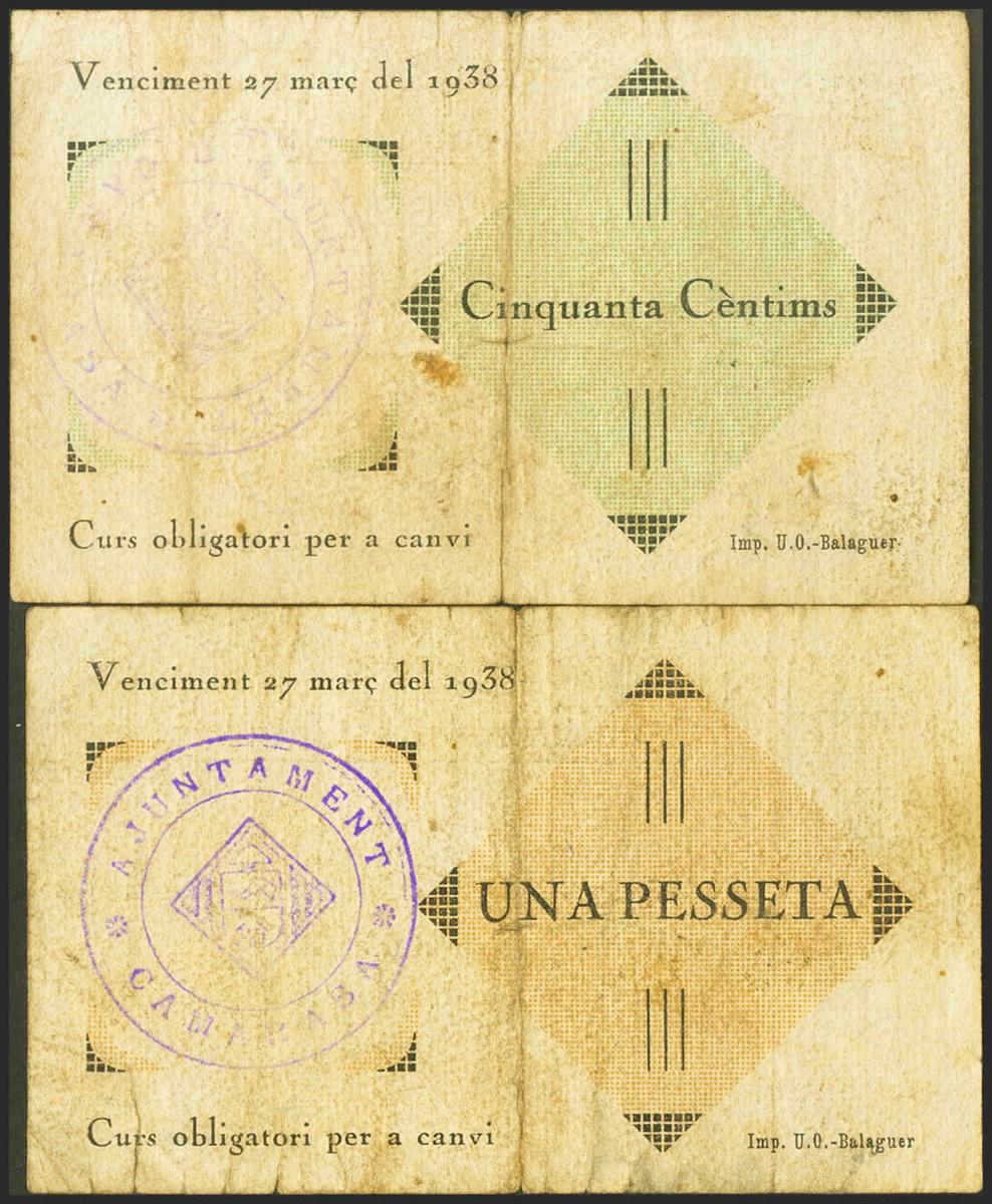 English CHAMBER (LERIDA). 50 Cents and 1 Peseta. March 1937. (González: 7315/16). Rare complete series. Very Fine.