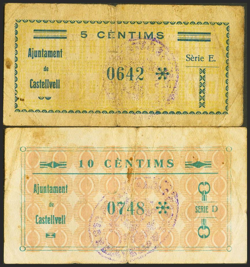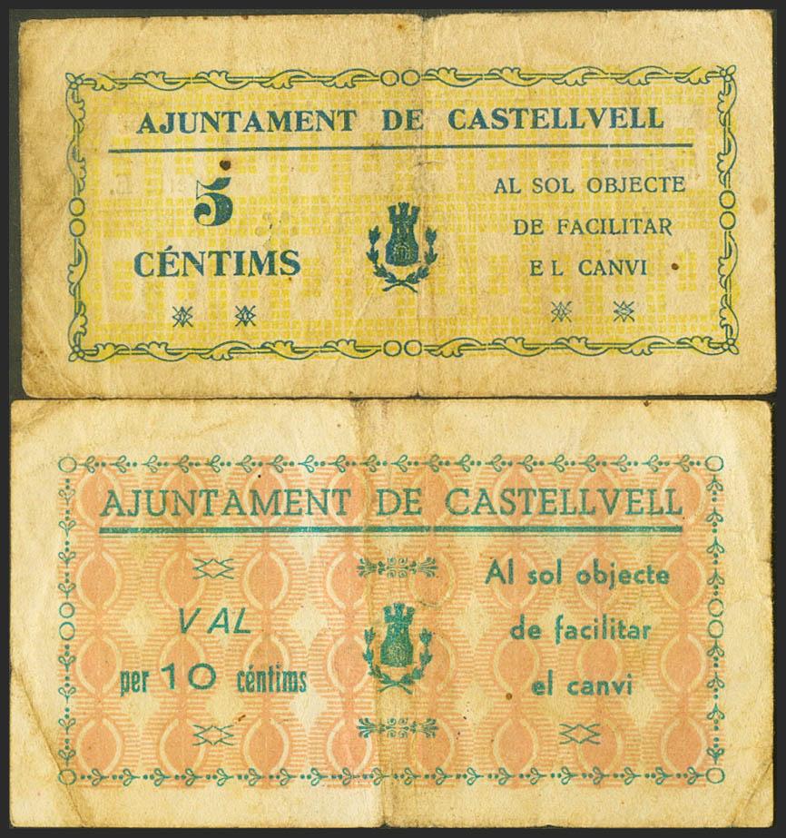 English CASTELLVELL (TARRAGONA). 5 Cents and 10 Cents. November 1937. Series E and D, respectively. (Gonzalez: 7517, 7518). very rare Almost Very Fine.