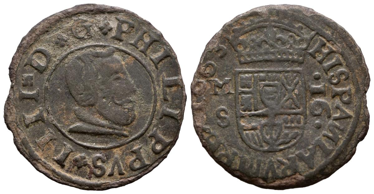 English PHILIP IV (1621-1665). 16 Maravedis. (Ae. 2.91g/26mm). 1663. Madrid Y. (Cal-2019-477). Almost Very Fine.