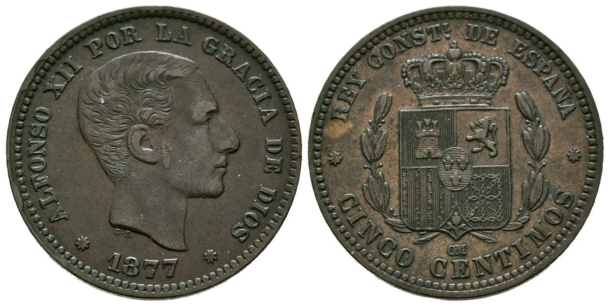 ALFONSO XII (1874-1885). 5 cents. (Cu. 5.17g/25mm). 1877. Barcelona OM. (Cal-2019-4). Extremely Fine.