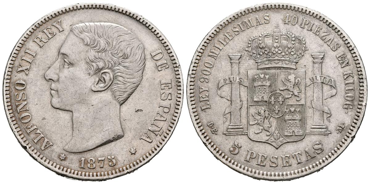 English ALFONSO XII (1874-1885). 5 pesetas. (Ar. 24.81g/37mm). 1875 *18-75. Madrid DEM. (Cal-2019-35). Good Very Fine.
