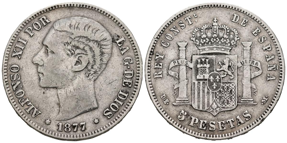 ALFONSO XII (1874-1885). 5 Pesetas (Arm. 24.55g/37mm). 1877. Stars barely visible. Madrid DEM. (Cal-2019-38). Very Fine.