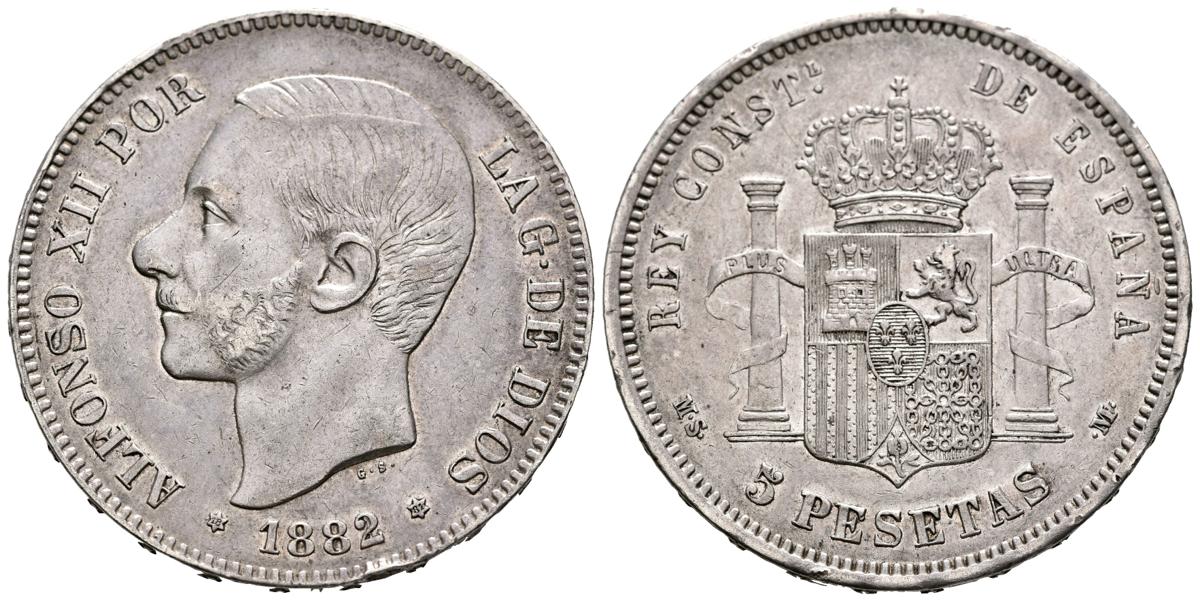 English ALFONSO XII (1874-1885). 5 pesetas. (Ar. 24.88g /37mm). 1882/1 *18-81. Madrid MSM. (Cal-2019-45). Good Very Fine. Limited.