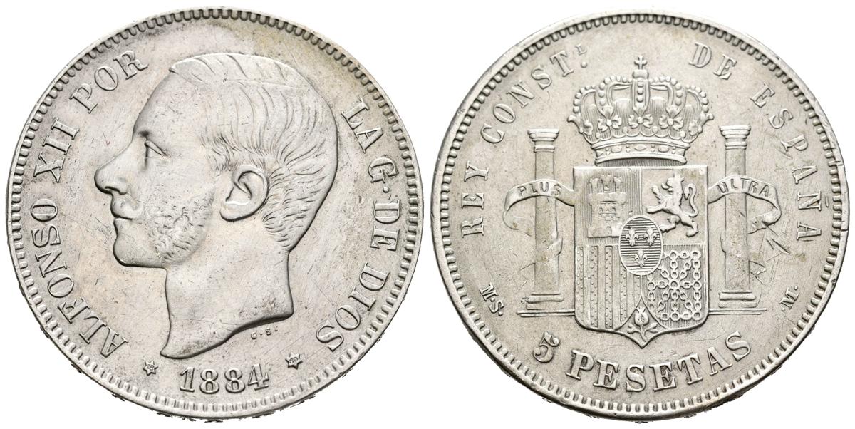 ALFONSO XII (1874-1885). 5 pesetas. (Ar. 24.80g/37mm). 1884 *18-84. Madrid MSM. (Cal-2019-57). Almost Extremely Fine. marquitas.