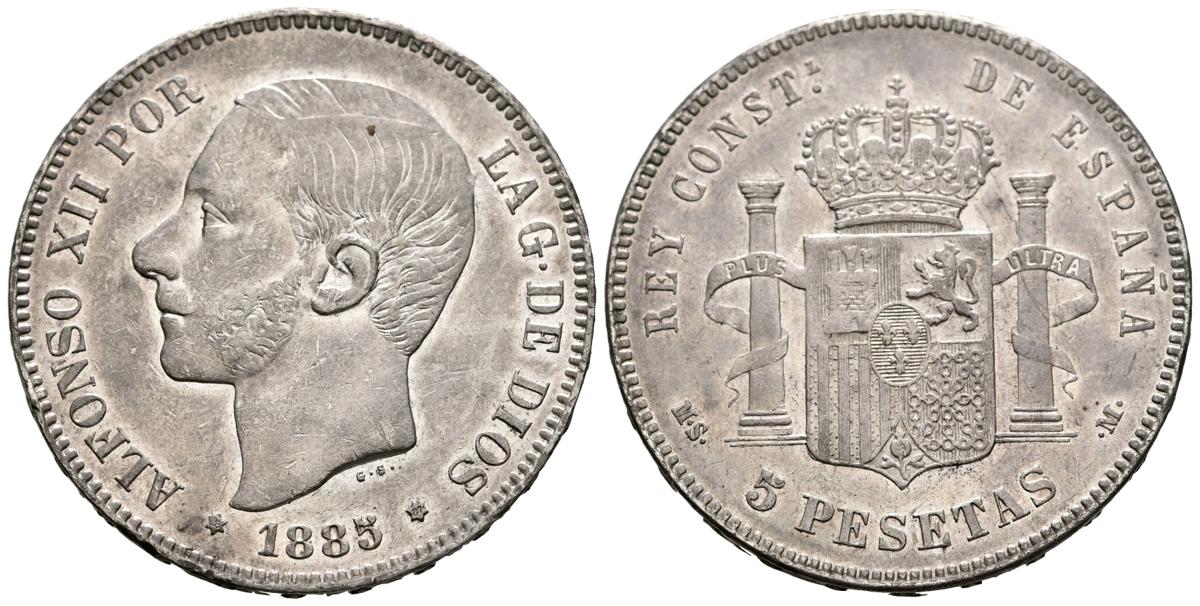 English ALFONSO XII (1874-1885). 5 pesetas. (Har. 25.15g/37mm). 1885 *18-87. Madrid MSM. (Cal-2019-62). Good Very Fine. Remains of original shine.