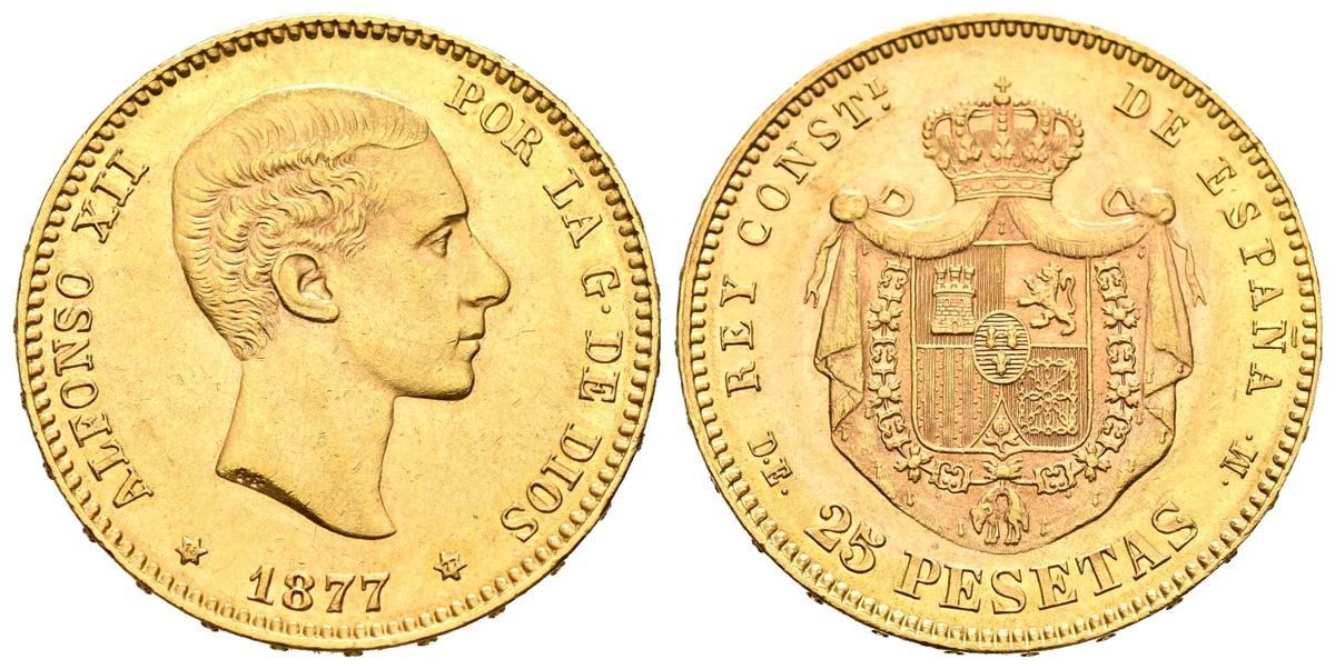 ALFONSO XII (1874-1885). 25 pesetas. (Au. 8.06g/24mm). 1877 *18-77. Madrid DEM. (Cal-2019-68). Extremely Fine. Slight marks.