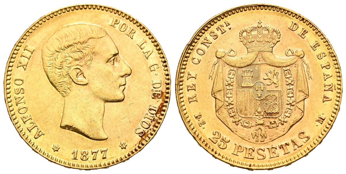 ALFONSO XII (1874-1885). 25 pesetas. (Au. 8.04g/24mm). 1877 *18-77. Madrid DEM. (Cal-2019-68). Almost Extremely Fine.