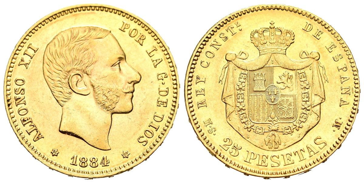 ALFONSO XII (1874-1885). 25 pesetas. (Au. 8.05g/24mm). 1884 *18-84. Madrid MSM. (Cal-2019-89). Extremely Fine. Scratch on the obverse. Limited.