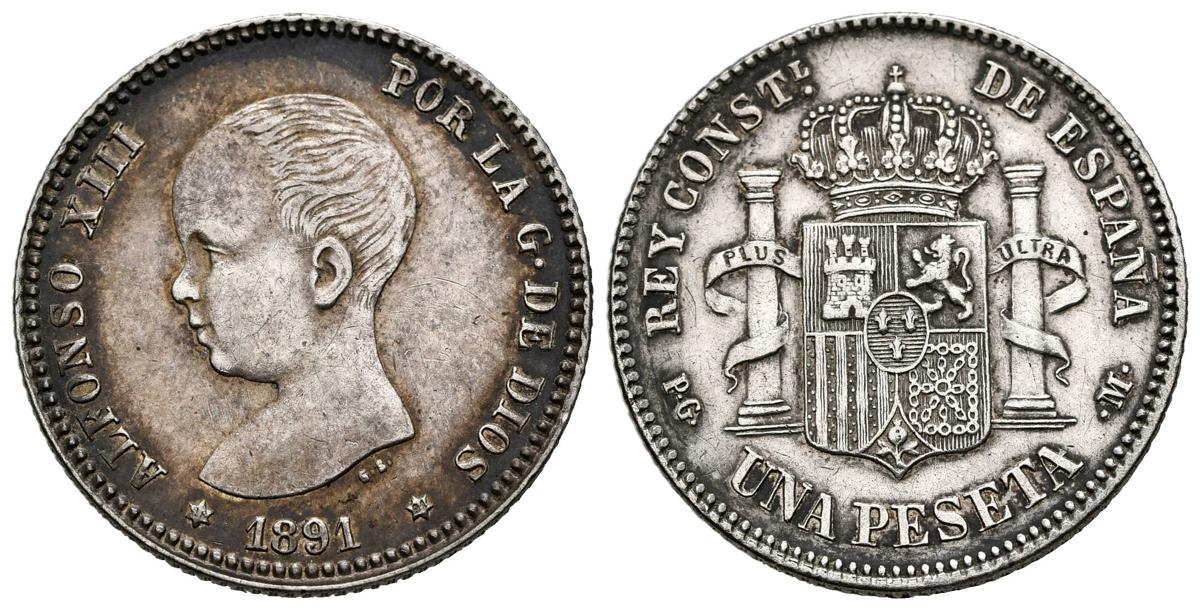 ALFONSO XIII (1885-1931). 1 Peseta (Ar. 5.00g/23mm). 1891 *18-91. Madrid PGM. (Cal-2019-53). Good Very Fine. Nice patina.