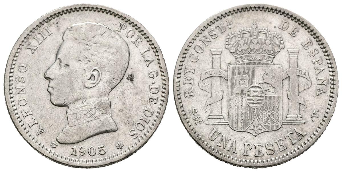 ALFONSO XIII (1885-1931). 1 Peseta (Arm. 4.88g /23mm). 1905 * 19-05. Madrid SMV. (Cal-2019-70). Very Fine. Good example for this type of pieces. Limited.