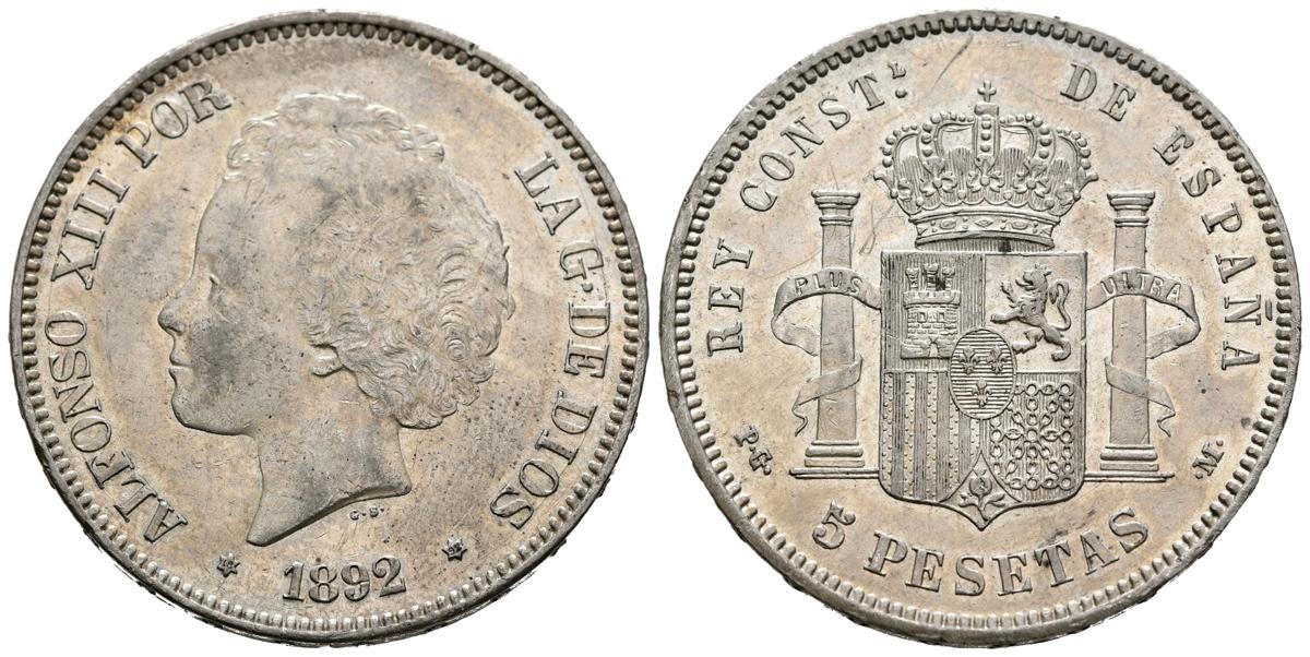 English ALFONSO XIII (1885-1931). 5 pesetas. (Ar. 24.97g/37mm). 1892 *18-92. Madrid PGM. (Cal-2019-100). Almost Extremely Fine. Remains of original shine. Scratch on reverse.