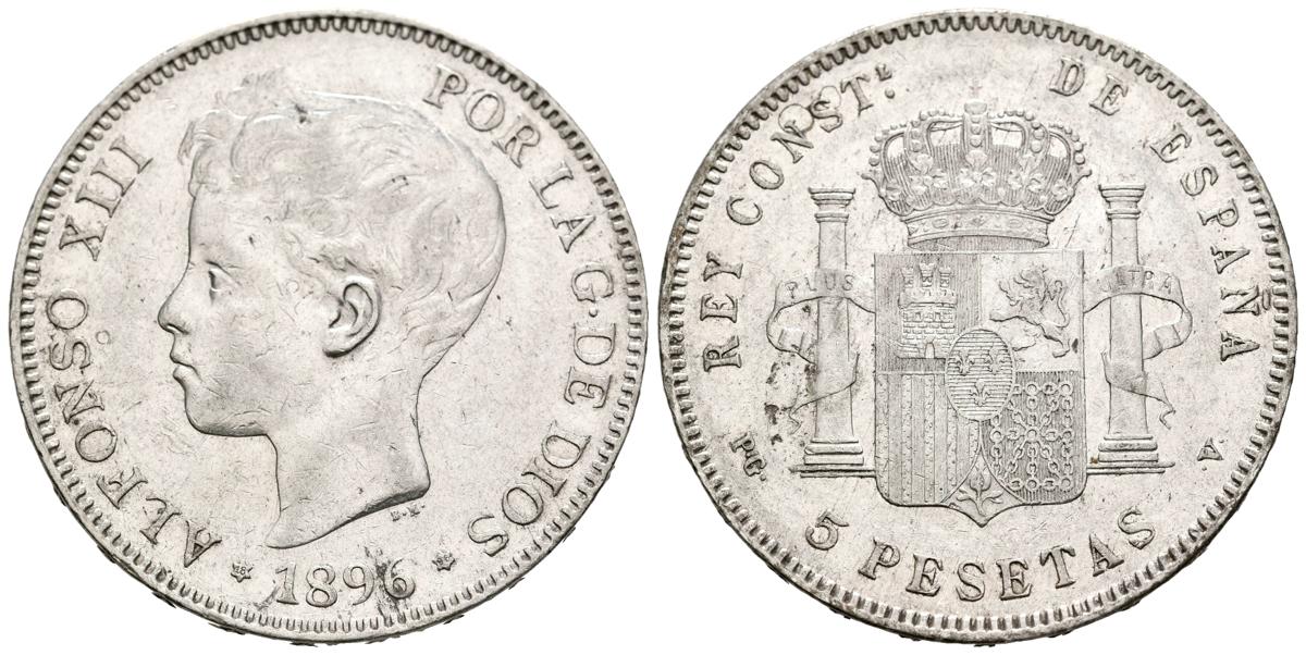 ALFONSO XIII (1885-1931). 5 pesetas. (Ar. 24.72g /37mm). 1896 *18-96. Madrid PGV. (Cal-2019-106). Good Very Fine. marquitas.