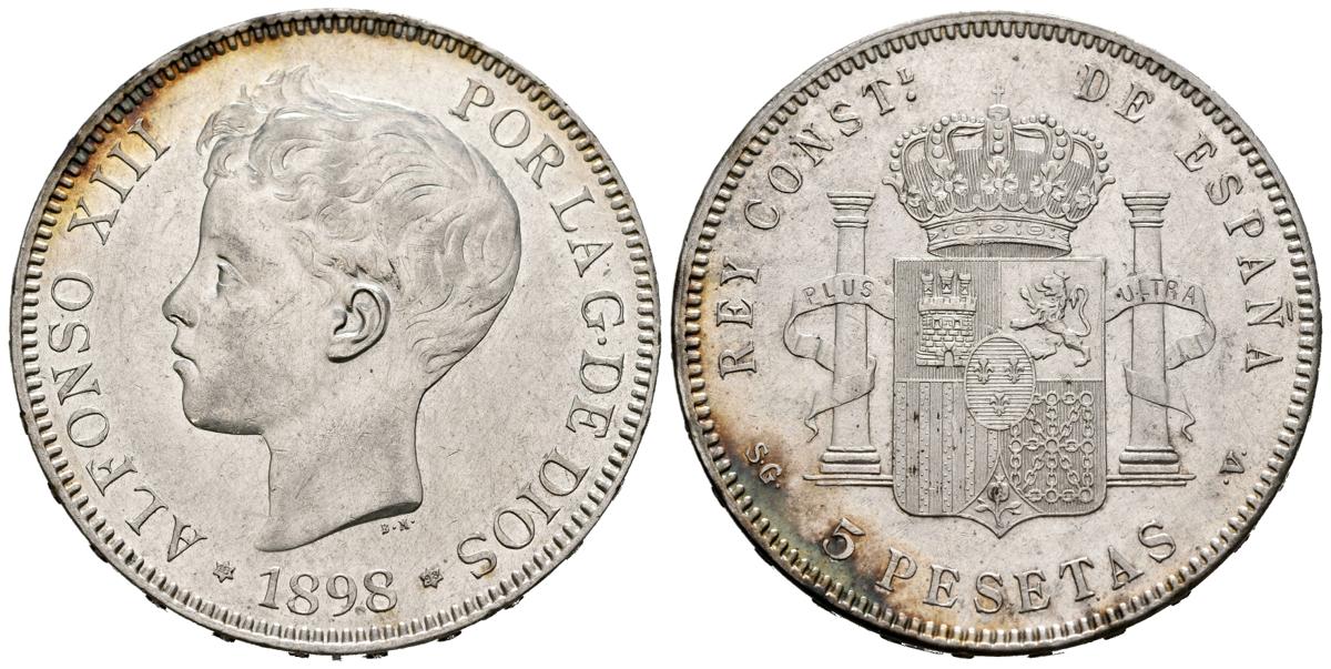 ALFONSO XIII (1885-1931). 5 pesetas. (Ar. 24.93g /37mm). 1898 *18-98. Madrid SGV. (Cal-2019-109). Almost Extremely Fine. marquitas.