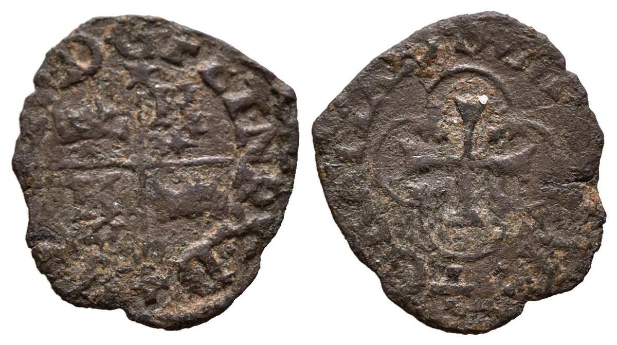 FRANCE, Henry IV (1589-1610). Béarn vaquette. (Ae. 0.44g/15mm). French Navarre. (Duplessy 1271). Obv: Cross with cows to the left in 1st and 4th quadrant and H crowned in 2nd and 3rd quadrant, around legend: HENRI 4 DGF ET N REX. Rev: Cross inside flowery graphic, around legend: GRATIA DE SVM ID QVOD SVM. Almost Very Fine.