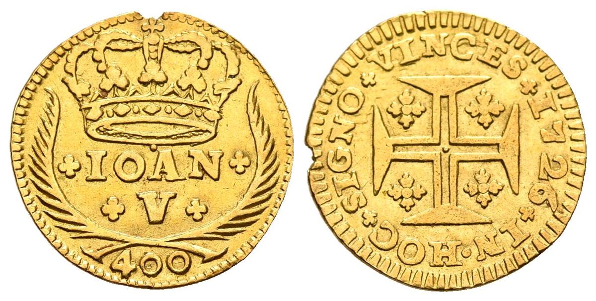 PORTUGAL. Cruzado Novo (Pinto). (Au. 1.00g/14mm). 1726. João V. (1706-1750). (Gomes 85.07). Crown of 5 arches. Almost Extremely Fine. Notch on edge.