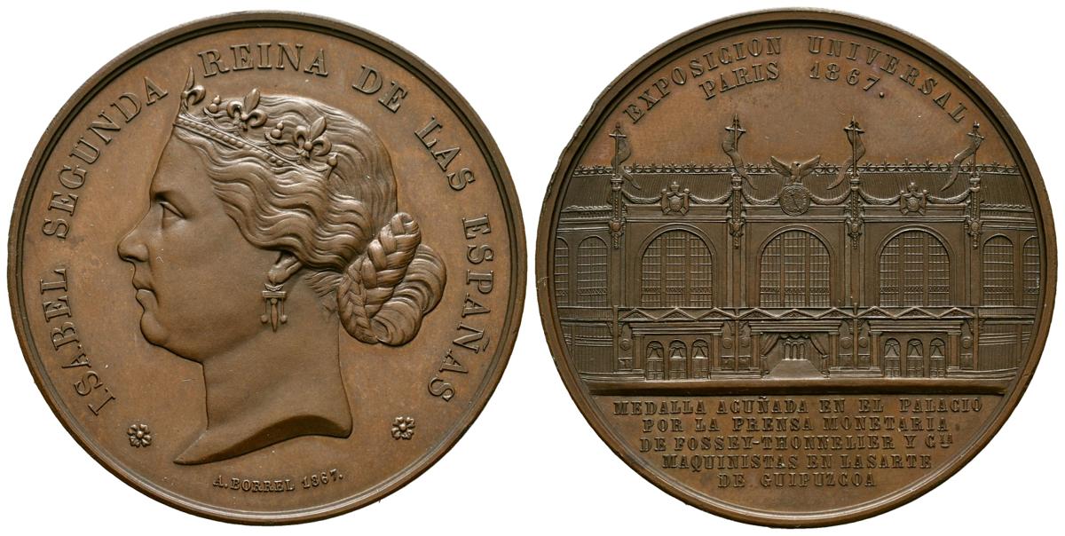 ELIZABETH II (1833-1868). Universal Exhibition in Paris (Ae. 51.75g/50mm). Recoinage of the Paris Mint between 1867 and 1880 (Cuivre en canto). Engraver: A. Borrel. (Ruiz Trapero 756-var). Good Extremely Fine. Tap on the edge. Beautiful tone. Includes case.