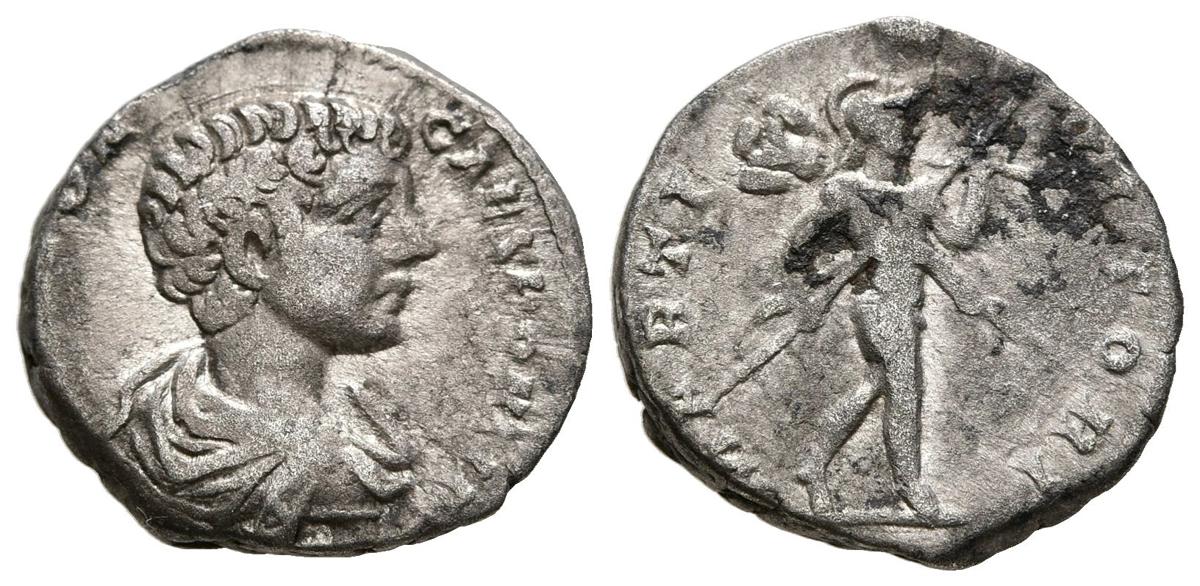 GETA. Denarius. (Ar. 3.07g/17mm). 203 AD Laodicea. (ICR 103). Obv: draped bust of Geta to right, around legend: P SEPTIMIVS GETA CAES. Rev: Mars advancing to the right carrying a spear and a trophy, around legend: MARTI VICTORI. Almost Very Fine.