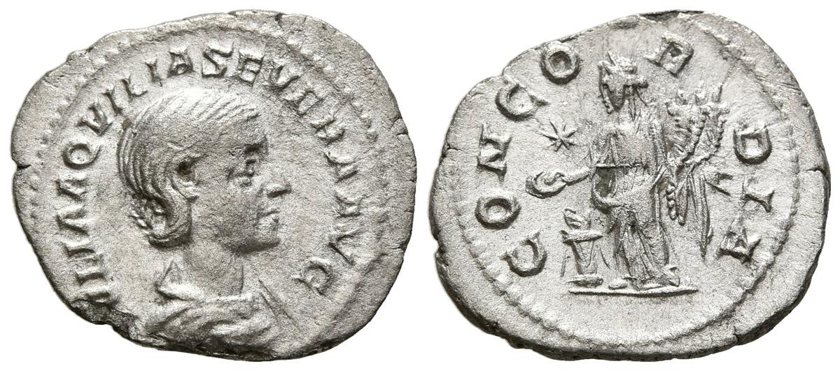 SEVERE AQUILYA. Denarius. (Ar. 2.26g/20mm). 220-221 AD Rome. (ICR 225). Obv: draped bust of Aquilia Severa to the right, around legend: IVLIA AQVILIA SEVERA AVG. Rev: Concordia standing to the left carrying a boat on the altar and cornucopia, in a star field, around the legend: CONCORDIA. Very Fine. Scarce specimen.