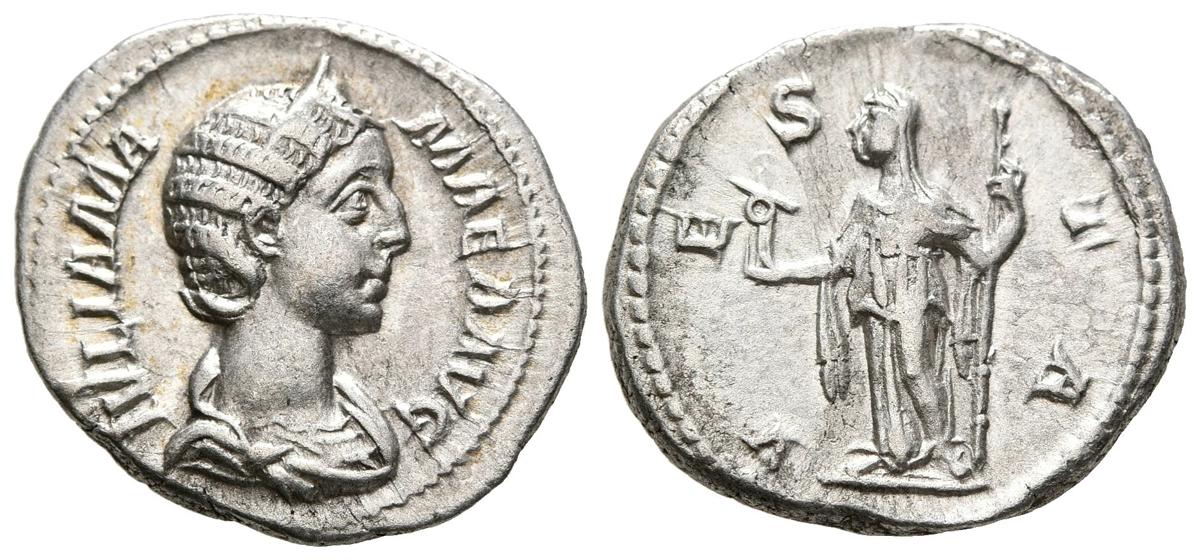 JULIA MAMAEA. Denarius. (Ar. 3.45g/20mm). 226 AD Rome. (RIC 360). Obv: Diademed and draped bust of Julia Mamaea to right, legend around: IVLIA MAMAEA AVG. Rev: Vesta standing to left carrying palladium and scepter, around legend: VESTA. Good Very Fine.