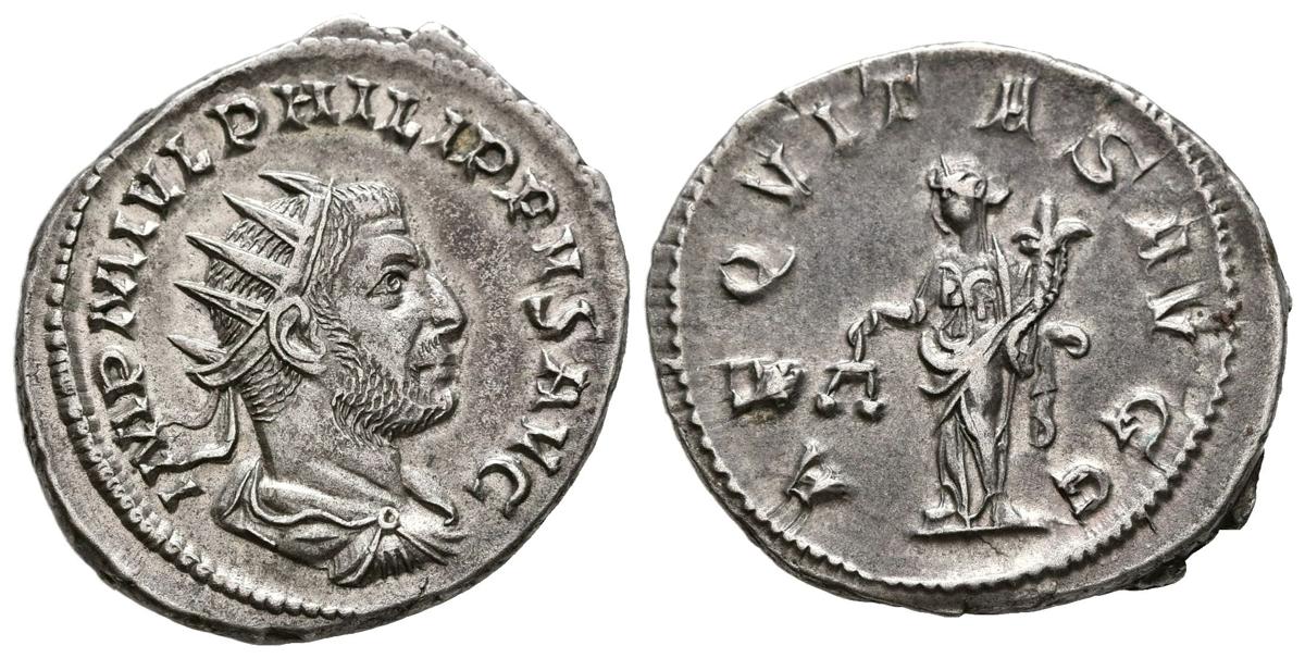 PHILIP I. Antoninianus. (Ar. 4.61g/24mm). 244-247 AD Rome. (ICR 27b). Obv: Radiated and draped bust of Philip I to right, around legend: IMP M IVL PHILIPPVS AVG. Rev: Aequitas standing to left carrying scales and cornucopia, around legend: AEQVITAS AVGG. Good Very Fine.