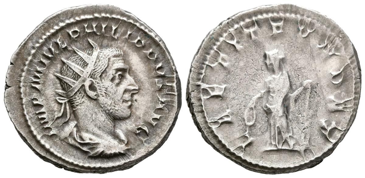 PHILIP I. Antoninianus. (Ar. 5.04g/24mm). 244 AD Rome. (ICR 35b). Obv: Radiated and draped bust of Philip I to right, around legend: IMP M IVL PHILIPPVS AVG. Rev: Laetitia standing to left wearing laurel wreath and helm, around legend: LAETIT FVNDAT. Almost Very Fine.