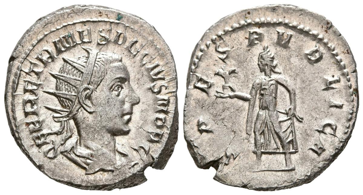 HERENNIUS ETRUSCUS. Antoninian. (Ar. 4.95g/23mm). 250-251 AD Rome. (ICR 149). Obv: Radiated and draped bust of Herenio Etrusco to right, legend around: Q HER ETR MES DECIVS NOB C. Rev: Spes advancing to left carrying flower, legend around: SPES PVBLICA. Almost Extremely Fine.