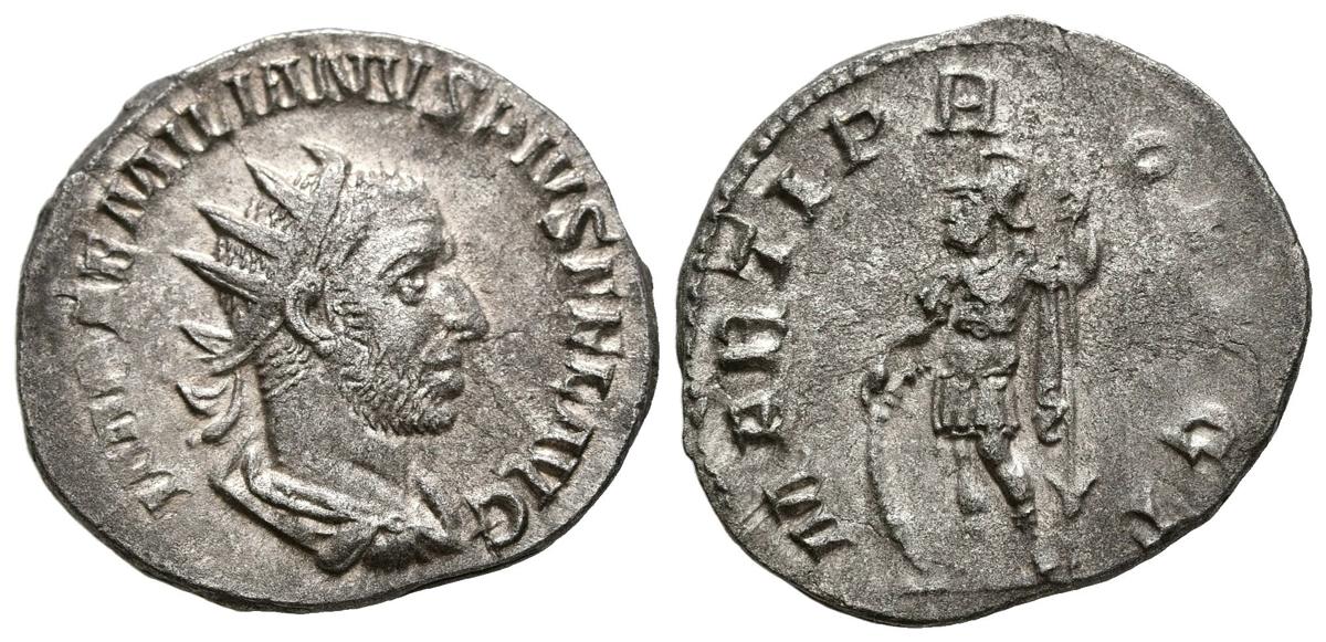 AEMILIAN. Antoninian. (Ar. 3.38g/21mm). 253 AD Rome. (RIC 6). Obv: Radiated and draped bust of Aemiliano to the right, around legend: IMP AEMILIANVS PIVS FEL AVG. Rev: Mars standing to left carrying shield and spear, around legend: MARTI PROPVGT. Good Very Fine. Minting vanes.