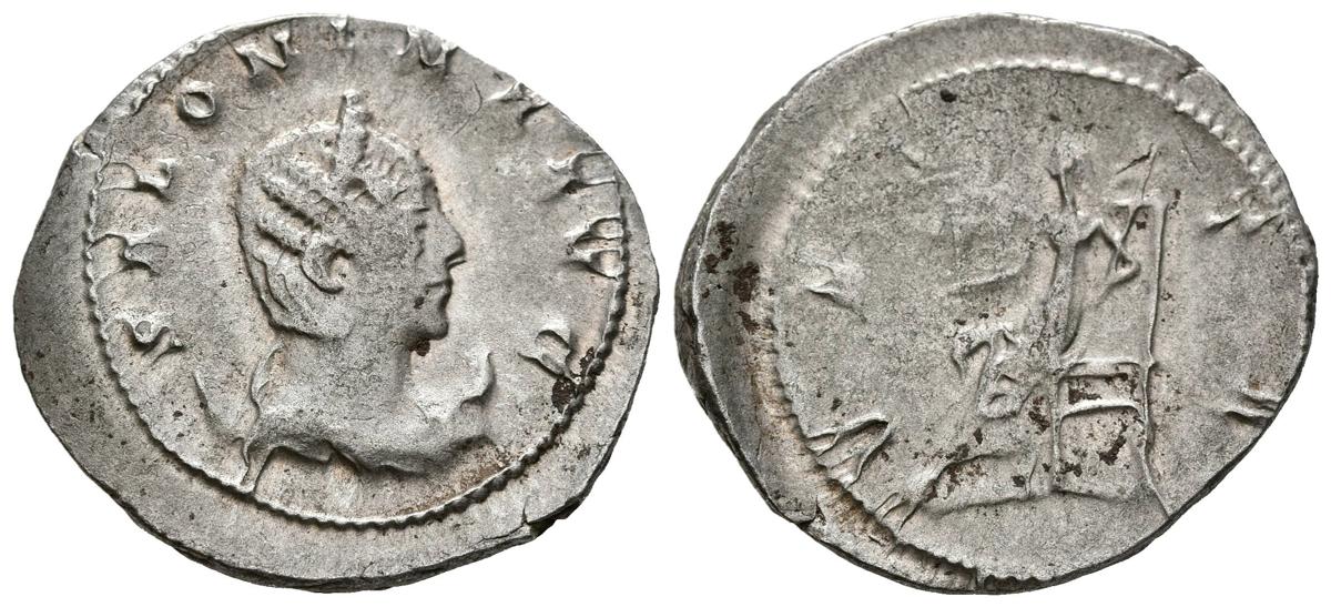 SALON. Antoninian. (Ae. 3.79g/25mm). 254-268 AD Cologne. (ICR 70). Obv: Diademed and draped bust of Salonina on crescent to right, around legend: SALONINA AVG. Rev: Vesta seated to the left carrying a patera and a scepter, around the legend: VESTA. Almost Very Fine.