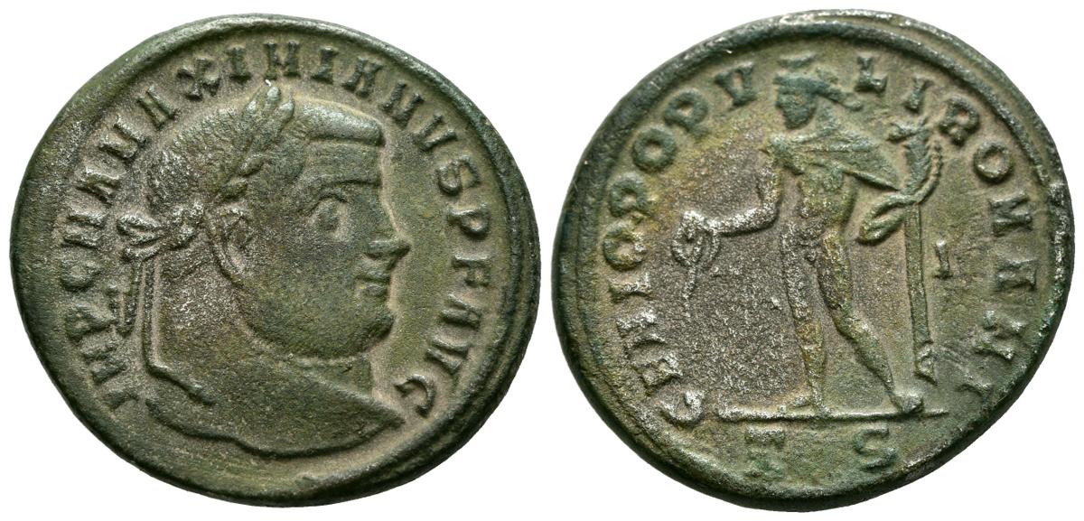 MAXIMIAN HERCULIUS. Follis. (Ae. 12.44g/29mm). 302-303 AD Thessalonica. (ICR 25b). Obv: Laureate head of Maximian Herculius to the right, around legend: IMP C MA MAXIMIANVS PF AVG. Rev: Genius standing to left carrying patera and cornucopia, in field r, in exergue: TS, around legend: GENIUS POPVLI ROMANI. Very Fine.