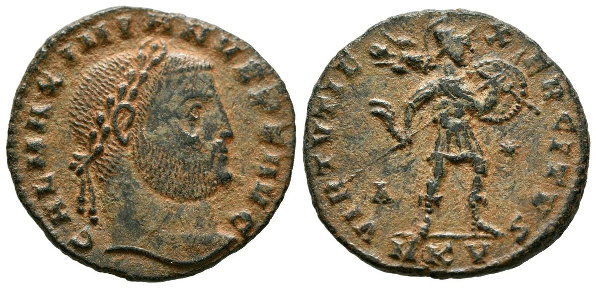 GALERIUS. Follis. (Ae. 5.56g/24mm). 308-309 AD Cycicus. (RIC 47). Obv: Laureate head of Galerius to right, legend around: GAL MAXIMIANVS PF AVG. Rev: Virtus advancing to the right carrying spear and shield, in field: A and star, in exergue: MKV, around legend: VIRTVTI EXERCITVS. Almost Very Fine.