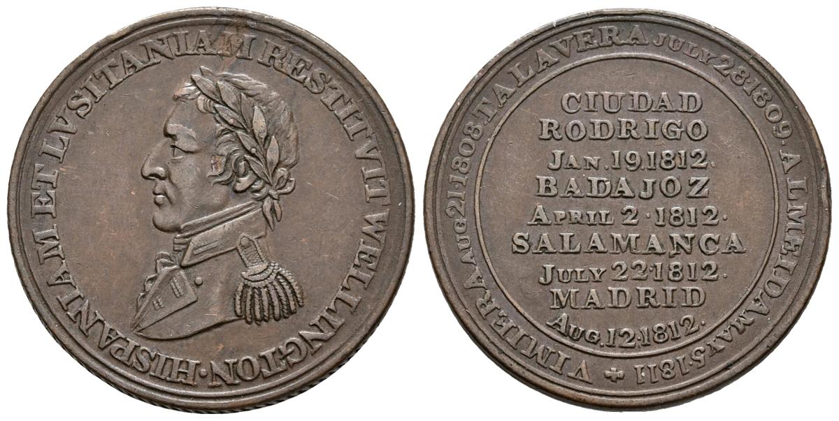 VICTORIAS DEL DUQUE DE WELLINGTON SOBRE NAPOLEON EN ESPAÑA Y PORTUGAL. Medalla. 1812. R/ Resumen de sus victorias. Vimiera 1808, Talavera 1809, Almeida 1811, Ciudad Rodrigo 1812, Badajoz 1812, Madrid 1812 y Salamanca 1812. Ae. 8,90g. 27mm. MBC+.