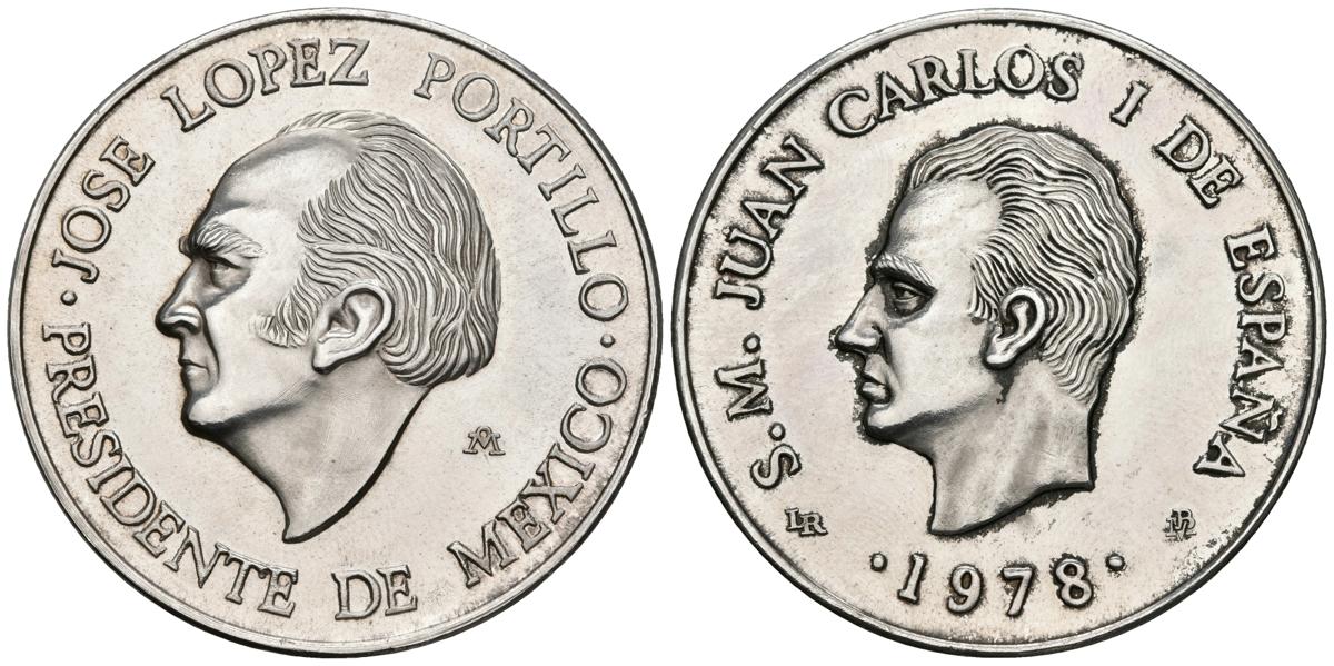 JUAN CARLOS I. Medalla. 1978. Visita del rey a México. R/ Presidente de México José López Portillo. Ar. 34,08g. 42mm. MBC+.