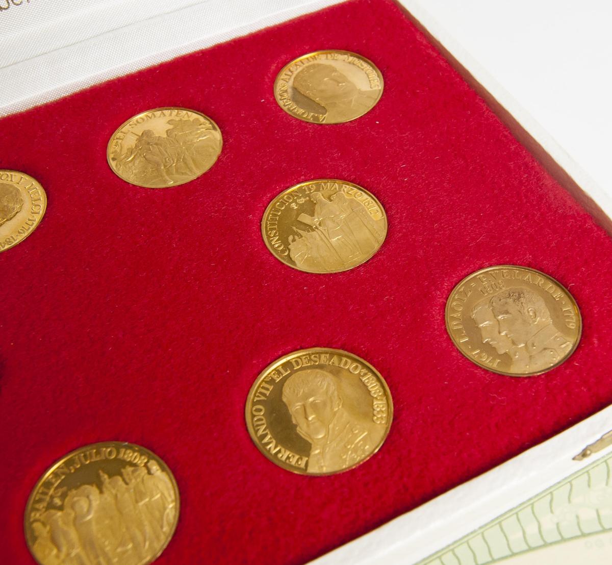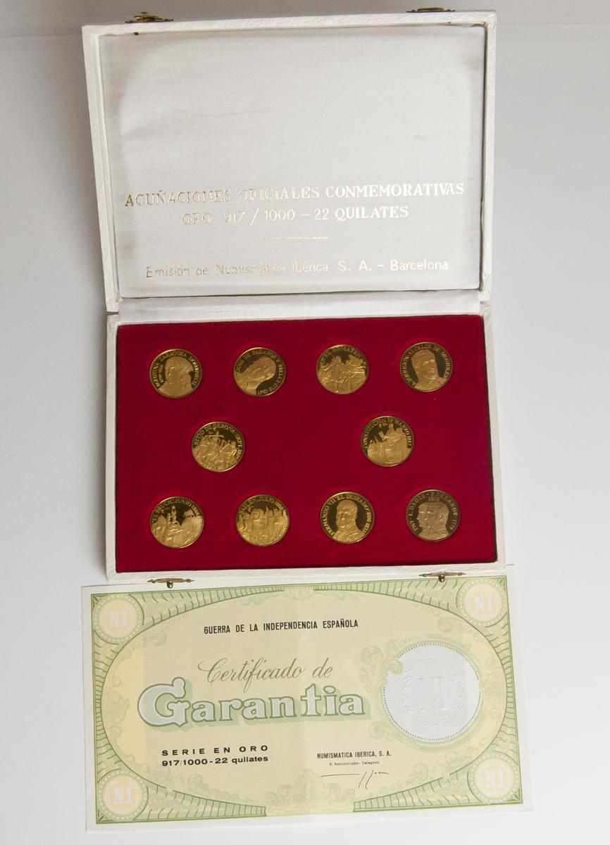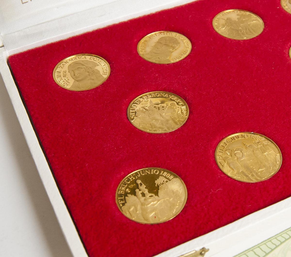 GUERRA DE INDEPENDENCIA ESPAÑOLA. Colección de 10 medallas de eventos ocurridos durante la Guerra de Independencia. 2 Mayo 1808; Agustina de Aragón; Sitio de Zaragoza; El Bruch; El Somatén; Sitio de Gerona; Bailén; Rey en campaña y Constitución 1812. Au. Peso total del conjunto 68,18g. Presentado en estuche oficial con certificado. SC.