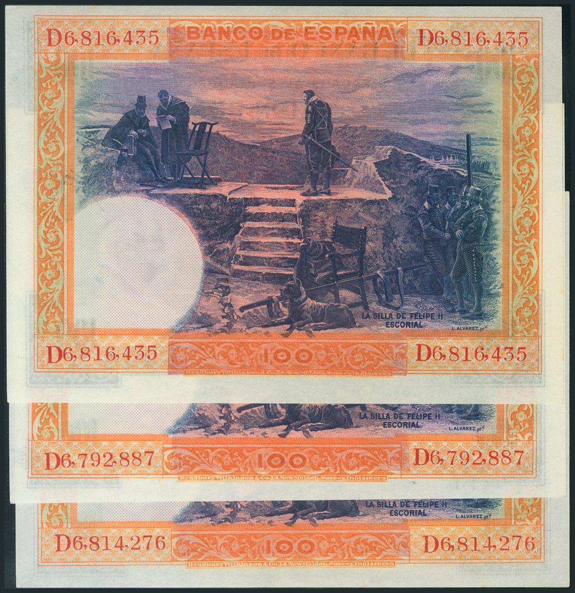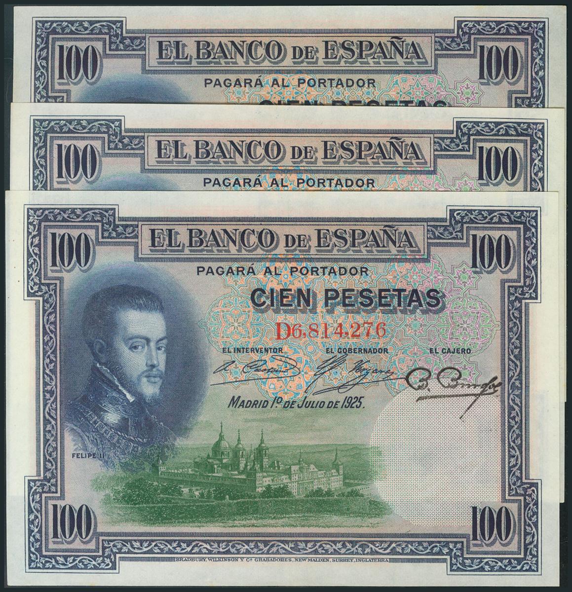 Conjunto de 3 billetes de 100 Pesetas emitidos el 1 de Julio de 1925, todos con la serie D (Edifil 2017: 350). SC-.