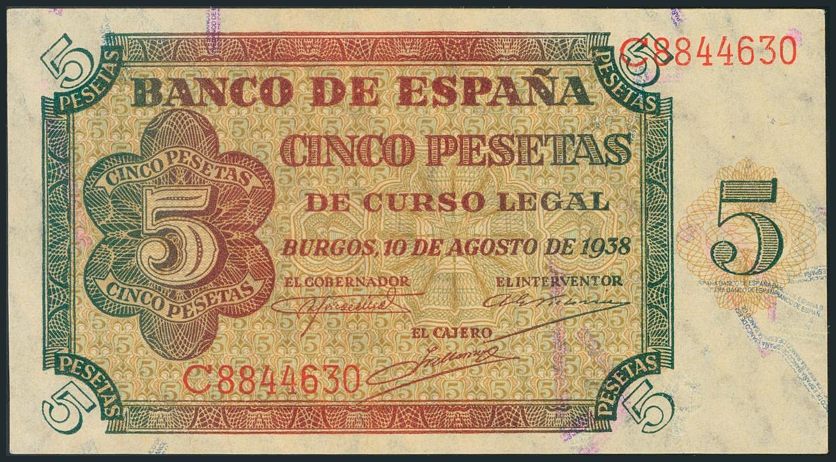 5 Pesetas. 10 de Agosto de 1938. Serie C. (Edifil 2017: 435a). Apresto original. SC-.