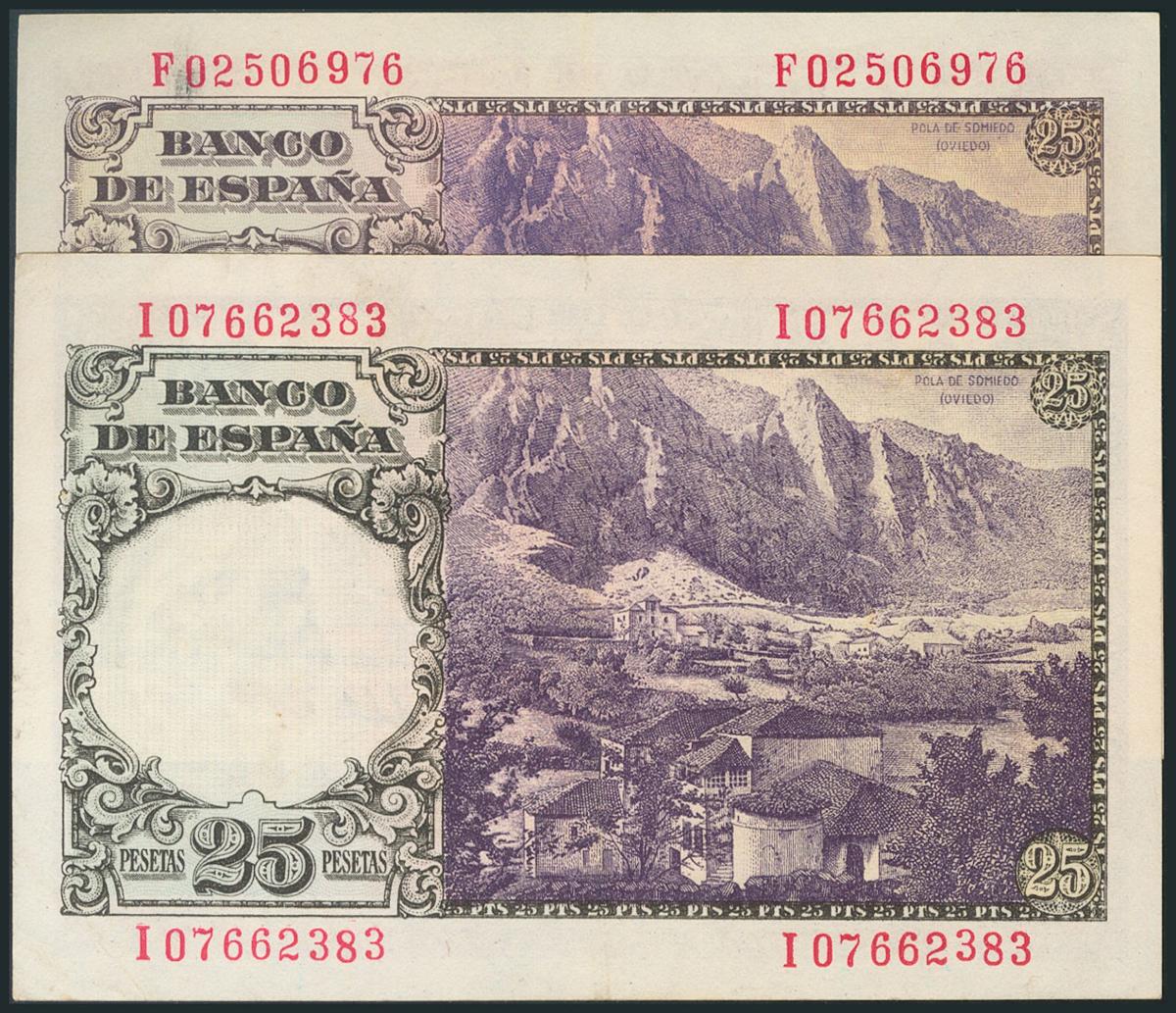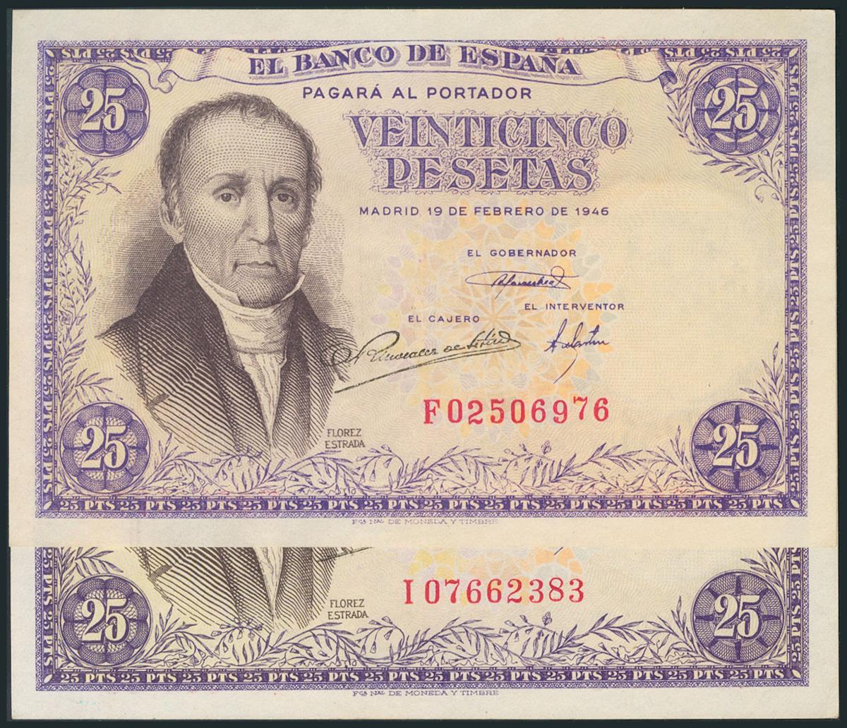 Conjunto de 2 billetes de 25 Pesetas emitidos el 19 de Febrero de 1946, serie F y I. (Edifil 2017: 450). EBC.