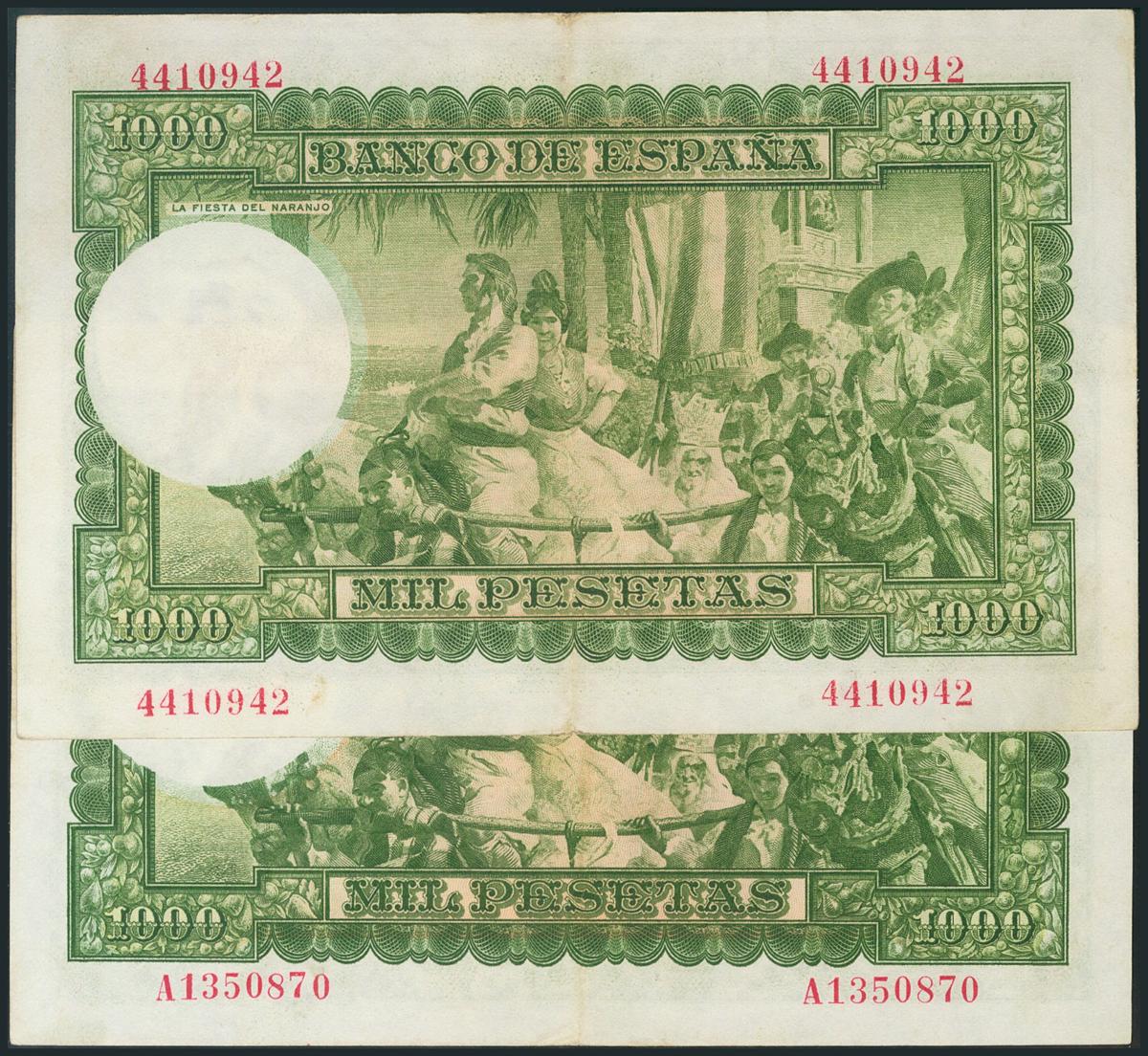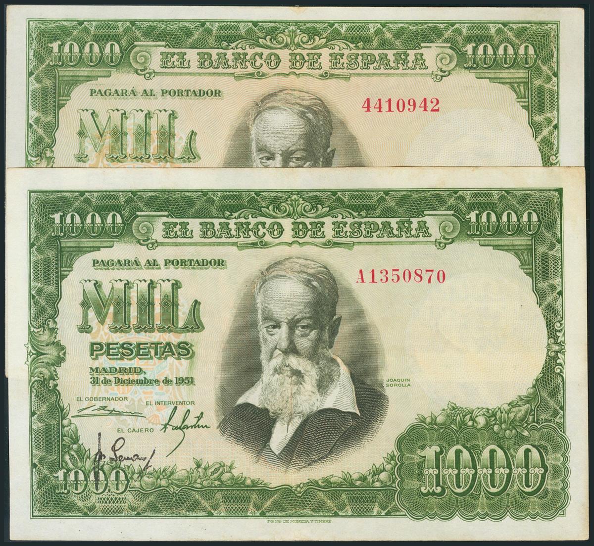 Conjunto de 2 billetes de 1000 Pesetas emitidos el 31 de Diciembre de 1951, sin serie y serie A (Edifil 2017: 463, 463a). BC.