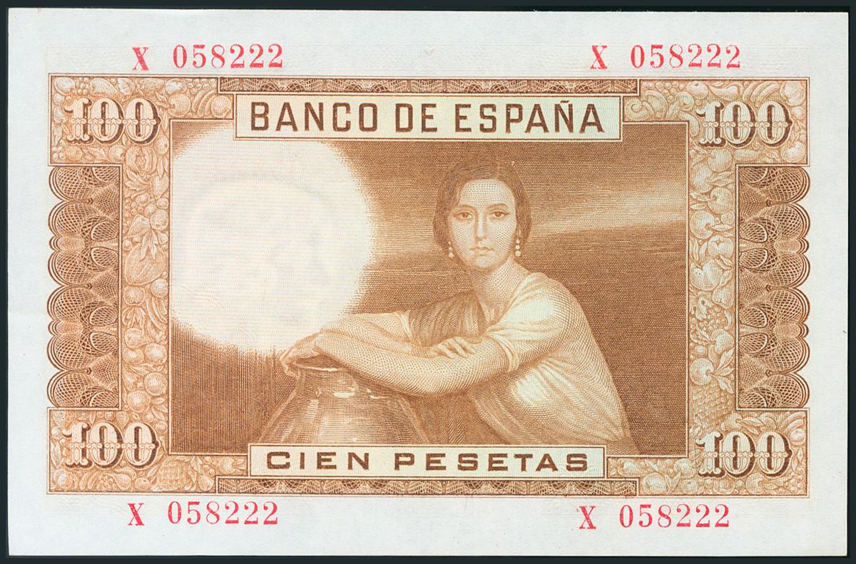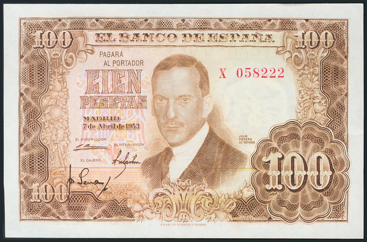 Conjunto de 7 billetes de 100 Pesetas emitidos el 7 de Abril de 1953, serie X (Edifil 2017: 464b). SC.
