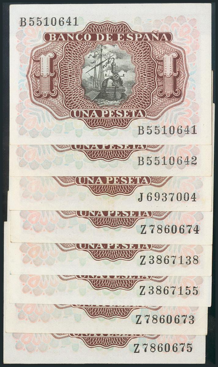 Conjunto de 8 billetes de 1 Peseta emitido el 22 de Julio de 1953 (Edifil 2017: 465a), diversas series. SC/EBC-.
