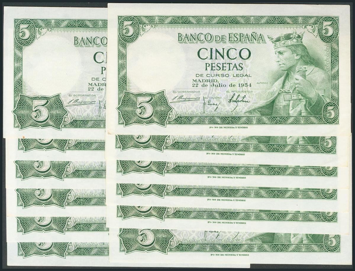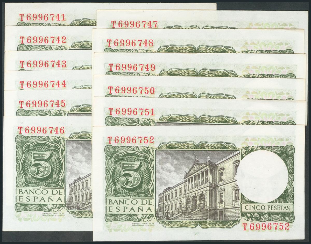 Conjunto de 12 billetes correlativos de 5 Pesetas emitidos el 22 de Julio de 1954, serie T (Edifil 2017: 466a). SC.