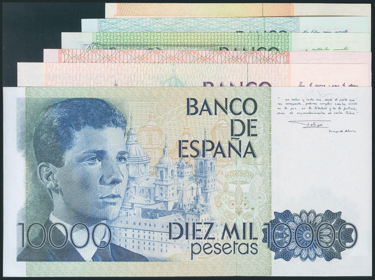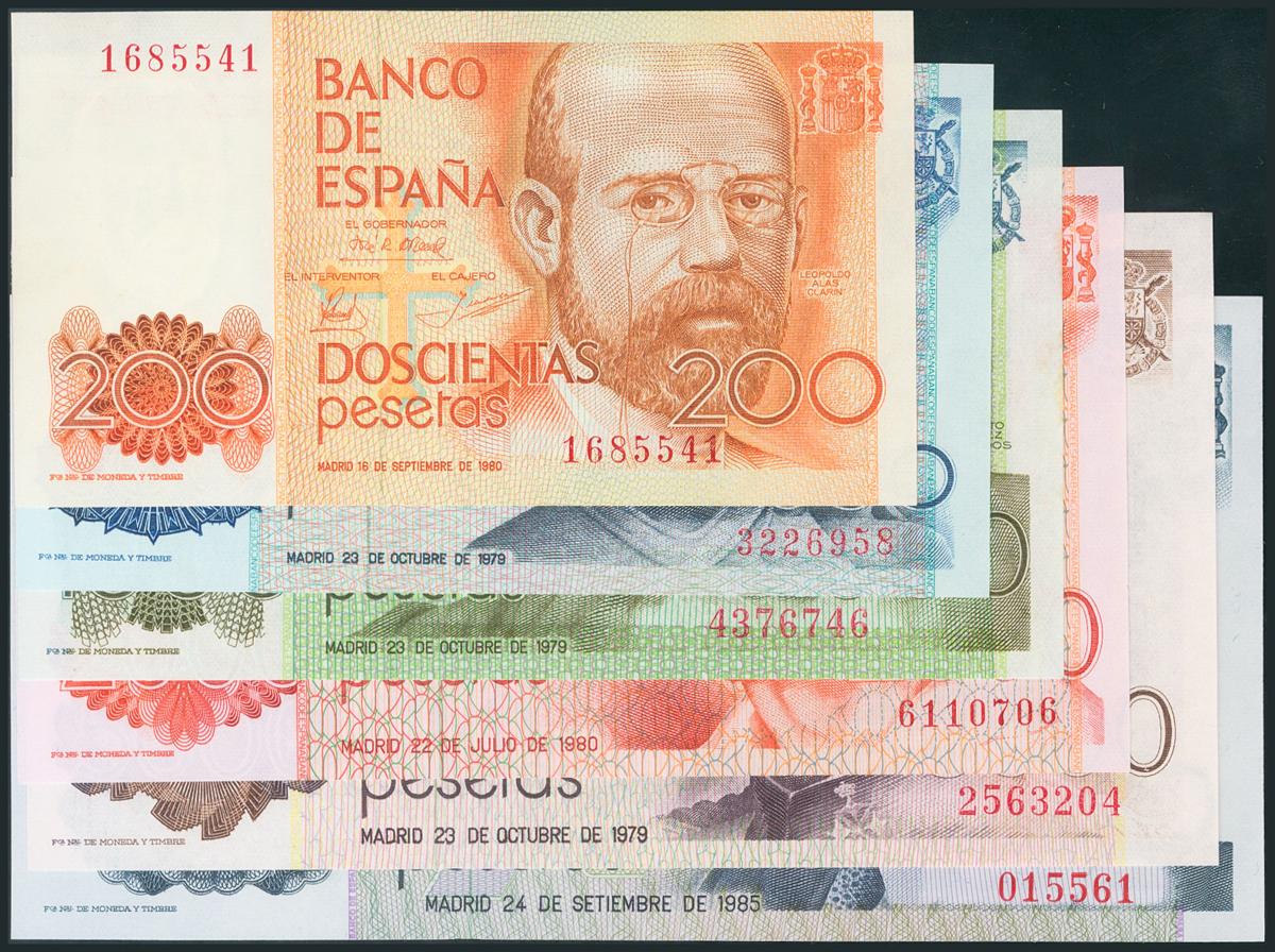 Serie completa de 5 billetes de 200, 500, 1000, 2000, 5000 y 10000 Pesetas emitidos entre 1979 y 1985, sin serie (Edifil 2017: 476/81). SC.