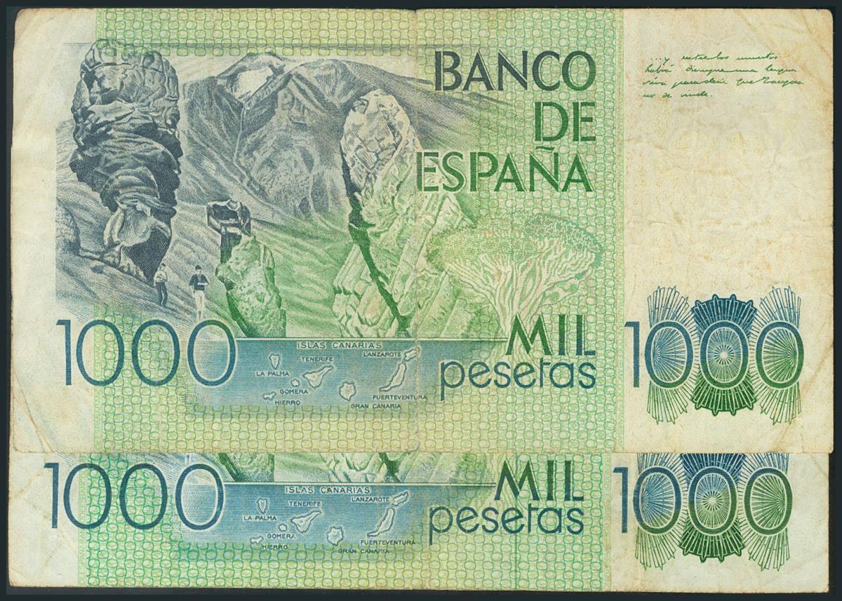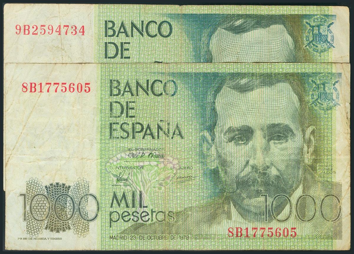 Conjunto de 2 billetes de 1000 Pesetas, emitidos el 23 de Octubre de 1979, con las series 8B y 9B, respectivamente. (Edifil 2017: 477c). RC.