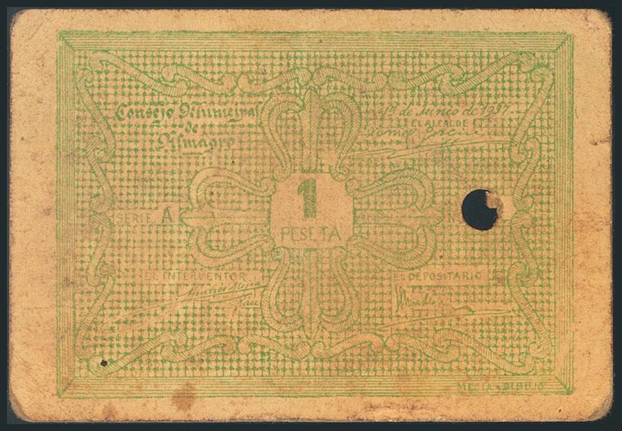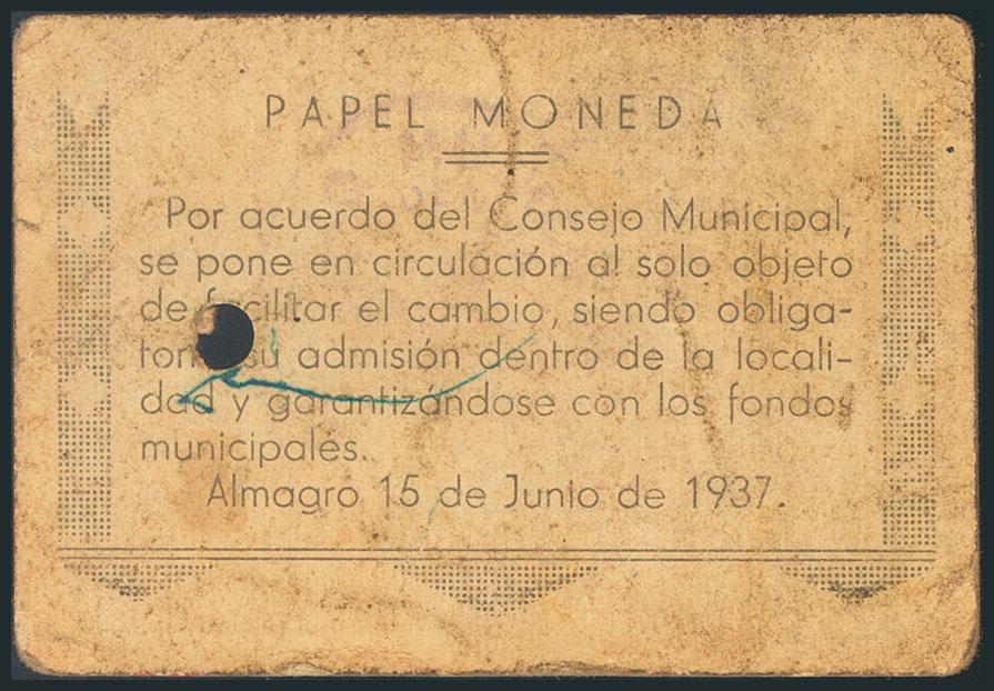 ALMAGRO (CIUDAD REAL). 1 Peseta. 15 de Junio de 1937. (González: 548). Inusual. BC.