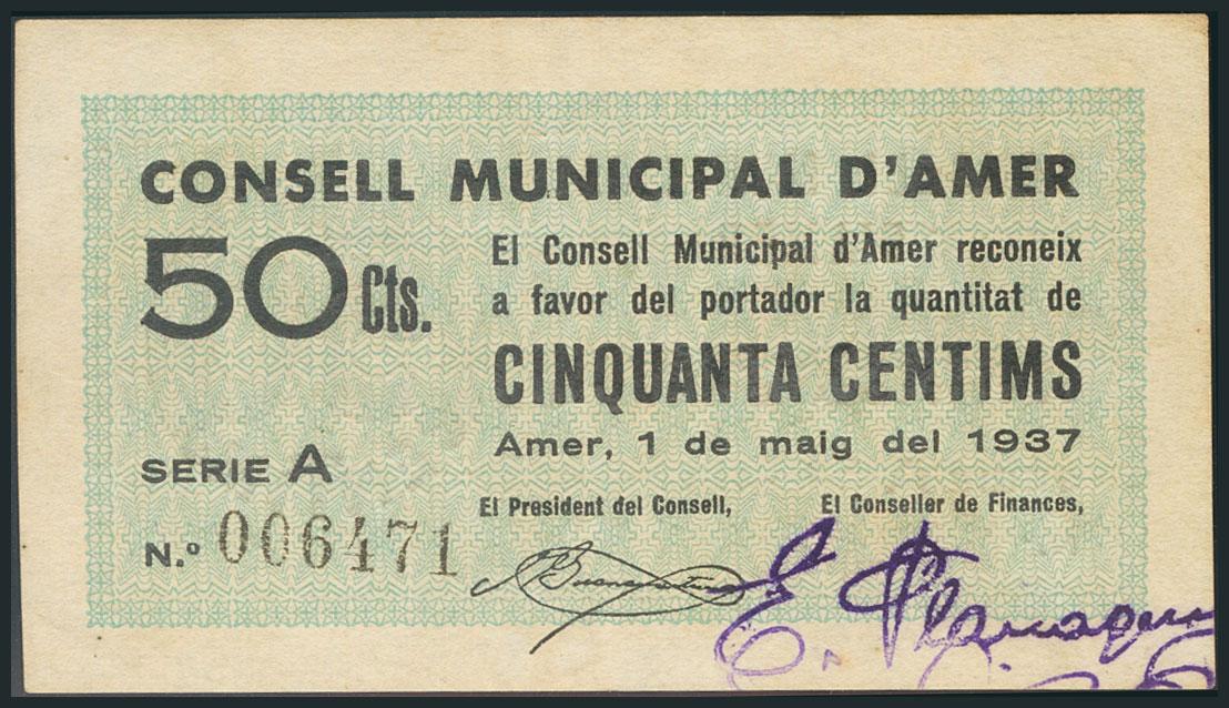 AMER (GERONA). 50 Céntimos. 1 de Mayo de 1937. MBC.