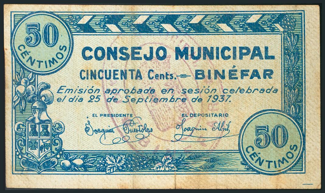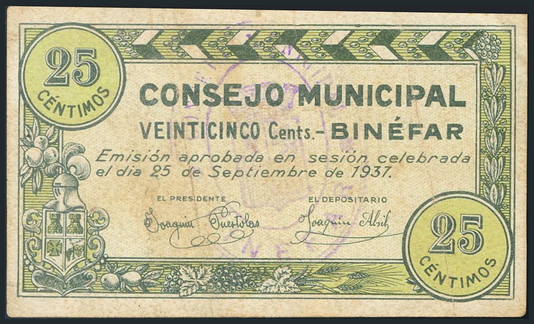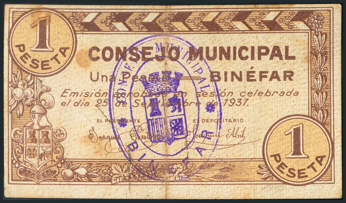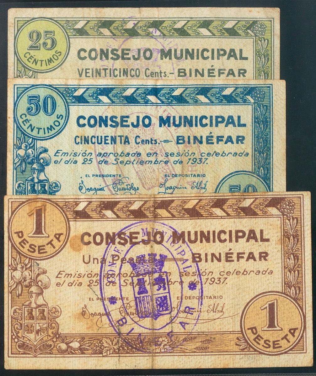 BINEFAR (HUESCA). 25 Céntimos, 50 Céntimos y 1 Peseta. 25 de Septiembre de 1937. (González: 1228, 1229, 1230). BC.